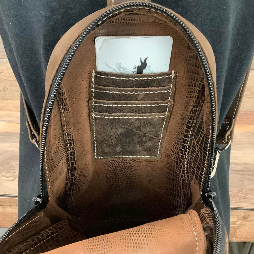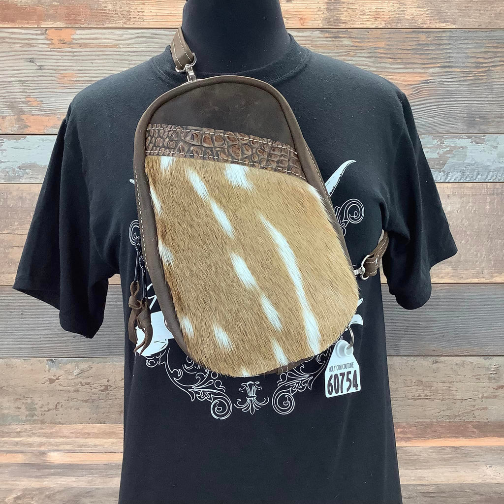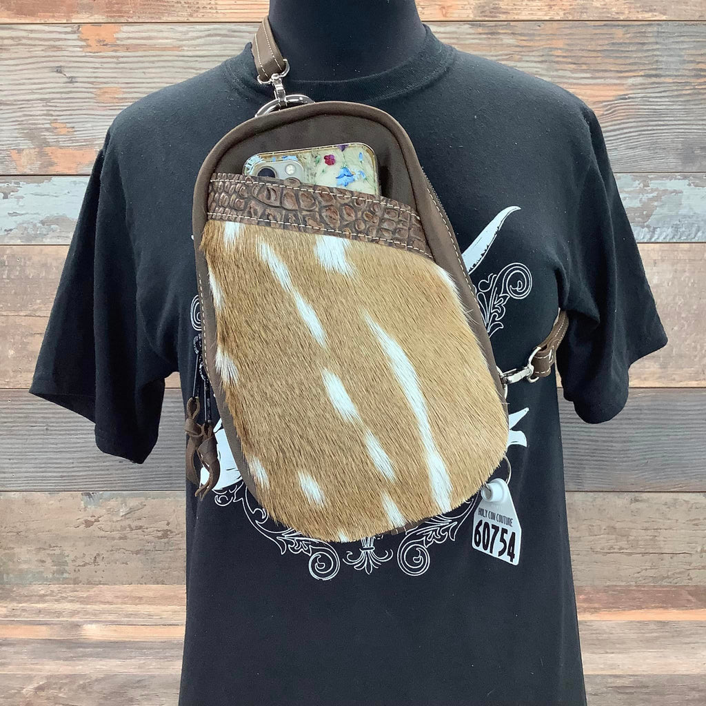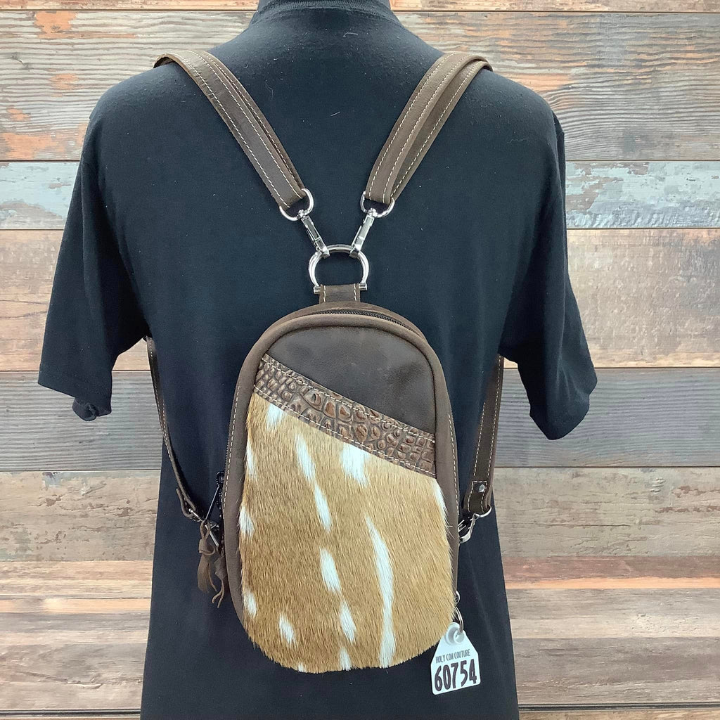 The Bum Pack!  The chic and versatile bag for the fashion-conscious cowgirl on the go!  The Bum Pack features a sleek design with a front panel crafted from genuine cowhide or genuine embossed leather.  The surrounding leather in rich colors adds a touch of sophistication and durability. Its compact size makes it perfect for carrying essentials like your phone, wallet, and keys, while keeping your hands free. The adjustable leather straps offer comfort and convenience, allowing you to wear it as a backpack, over your shoulder or as a crossbody.  Whether you're navigating the rodeo, a music festival or exploring the city, the Bum Pack combines practicality with an edge of rustic elegance.