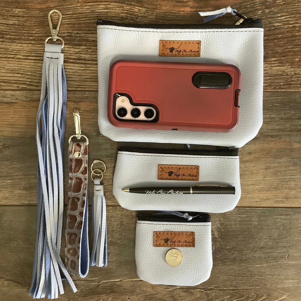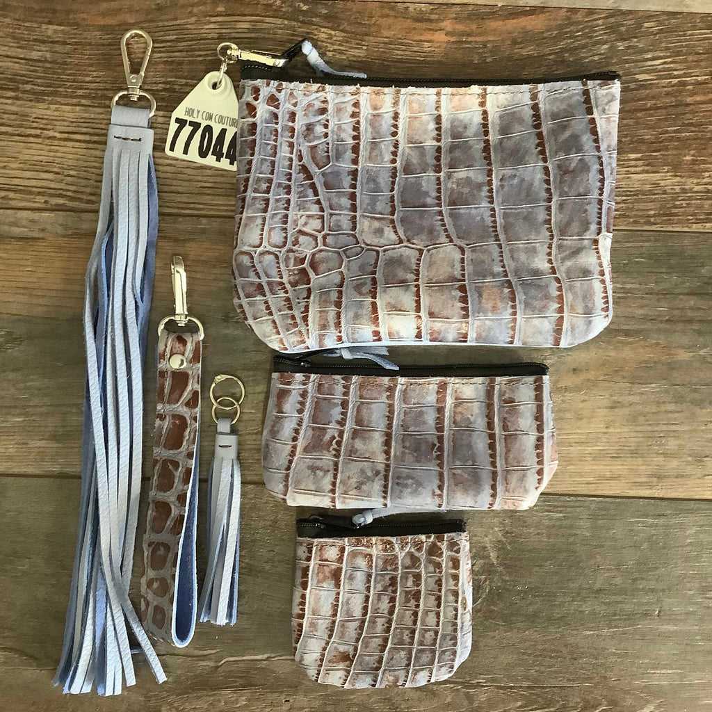 A favorite of our HCC customers, our Matchtastic sets are beautiful matching set to complete your purse or tote collection. The fronts are a signature look with genuine embossed leather and genuine premium solid leather on the back. The pouches are competed with a zipper closer and leather pull.