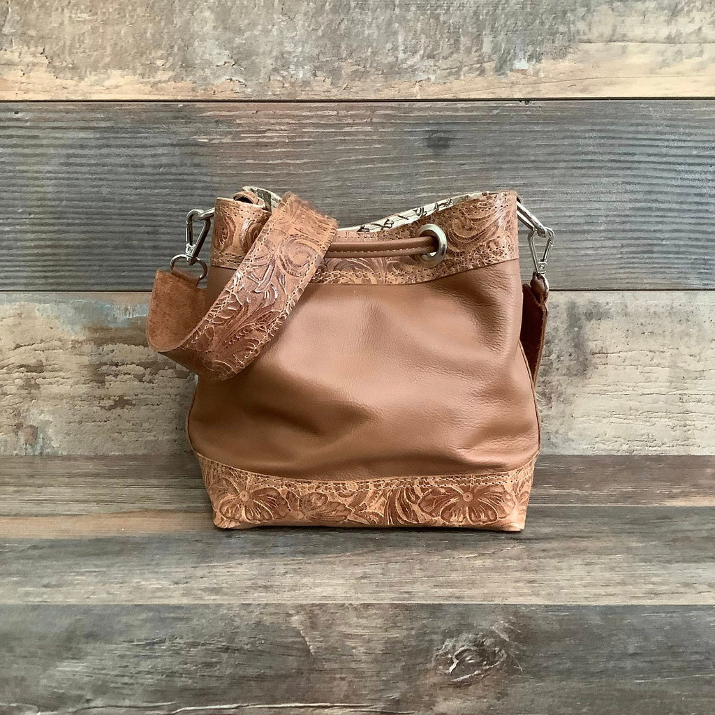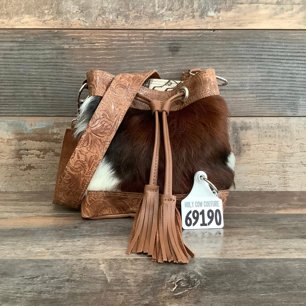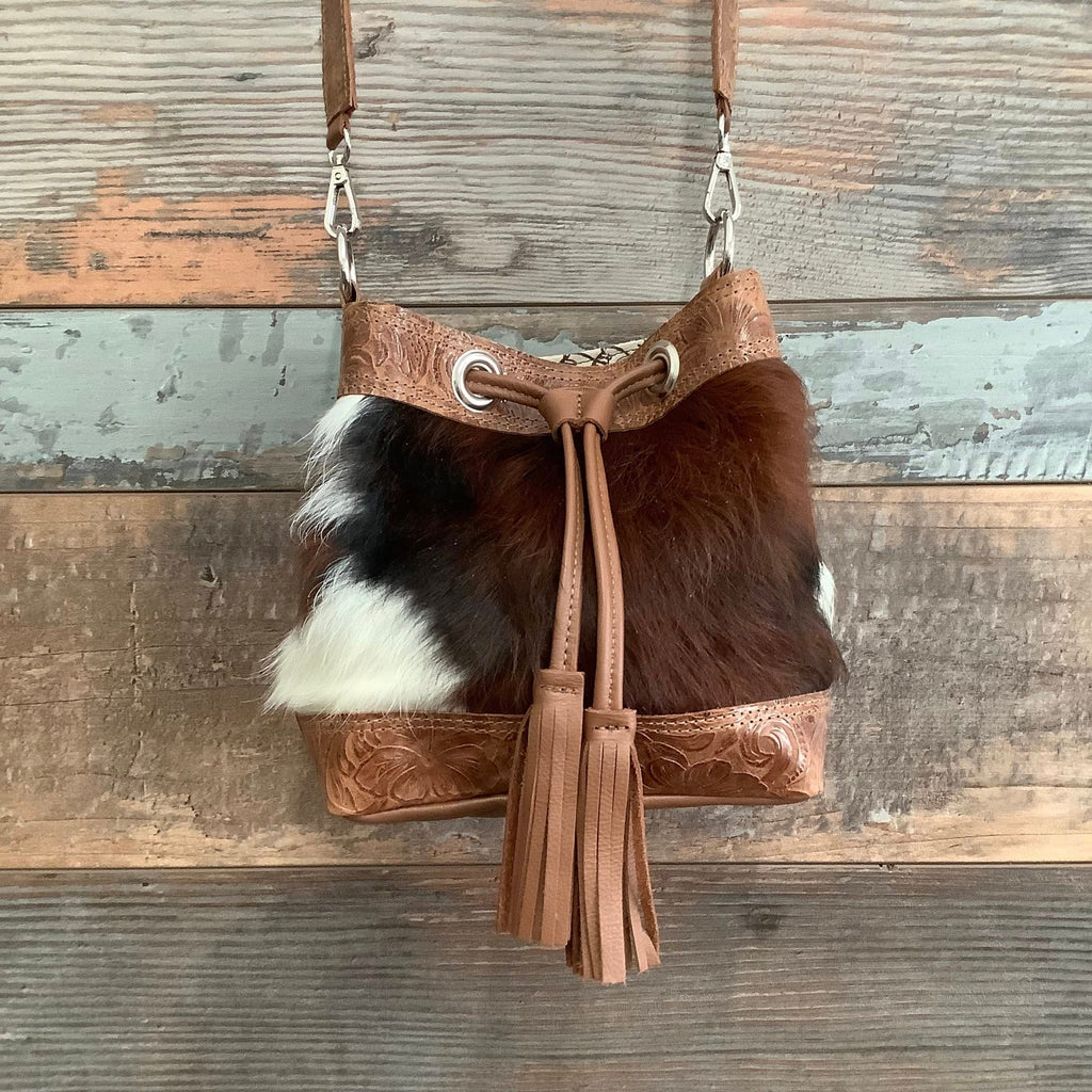 Our "Mini" Feed Bucket is a smaller size bucket purse that hold your essentials plus more miscellaneous necessities!  Our HCC Bandit Wallet fits perfectly in this bag. This fashionable small bucket purse can be worn open for easy use and cinched up for security with the leather drawstring. You can fill this bag to the brim or carry a few items. A comfortable shoulder strap has a suede lining bottom for a non-slip shoulder design.