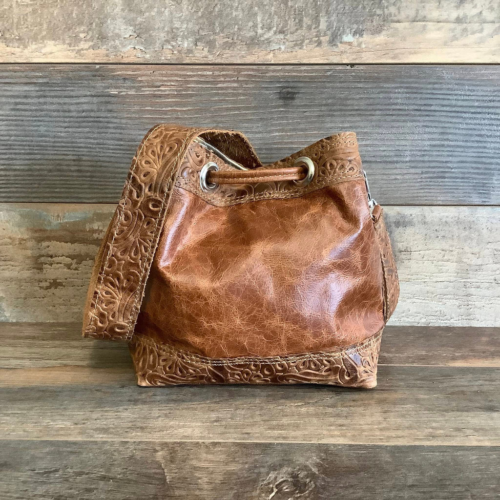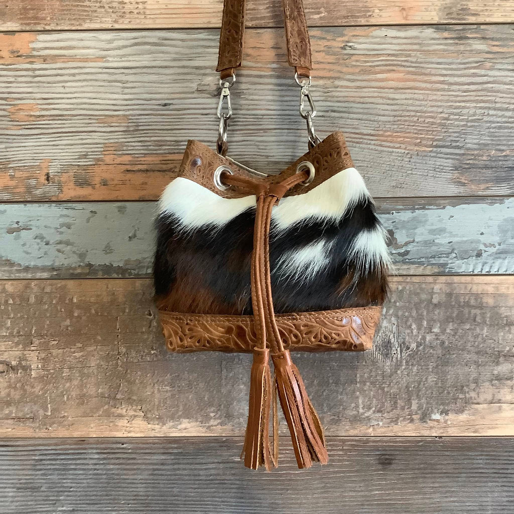 Our "Mini" Feed Bucket is a smaller size bucket purse that hold your essentials plus more miscellaneous necessities!  Our HCC Bandit Wallet fits perfectly in this bag. This fashionable small bucket purse can be worn open for easy use and cinched up for security with the leather drawstring. You can fill this bag to the brim or carry a few items. A comfortable shoulder strap has a suede lining bottom for a non-slip shoulder design.