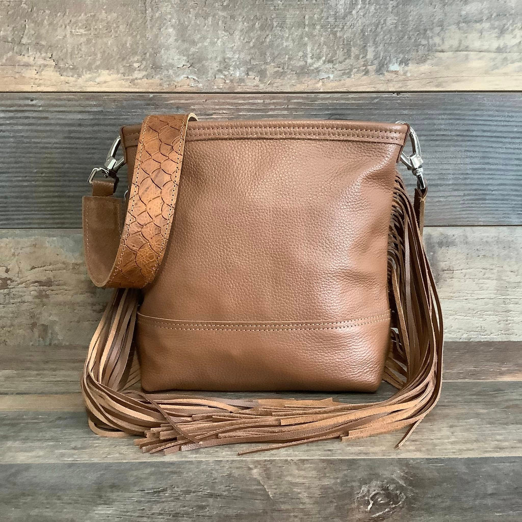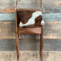 The Mini Messenger is a classic messenger bag with a cowgirl spin. This softly structured bucket bag is a great size for everyday use, and casual enough to take just about anywhere. It is lined with a soft flocked fabric and has an interior pocket for convenience. Made with natural hair-on hide and premium full-grain leather, each bag in the series has unique embossed leather trim with matching shoulder strap. Check out the classy bolero tie detail on some of the models in this stunning collection.