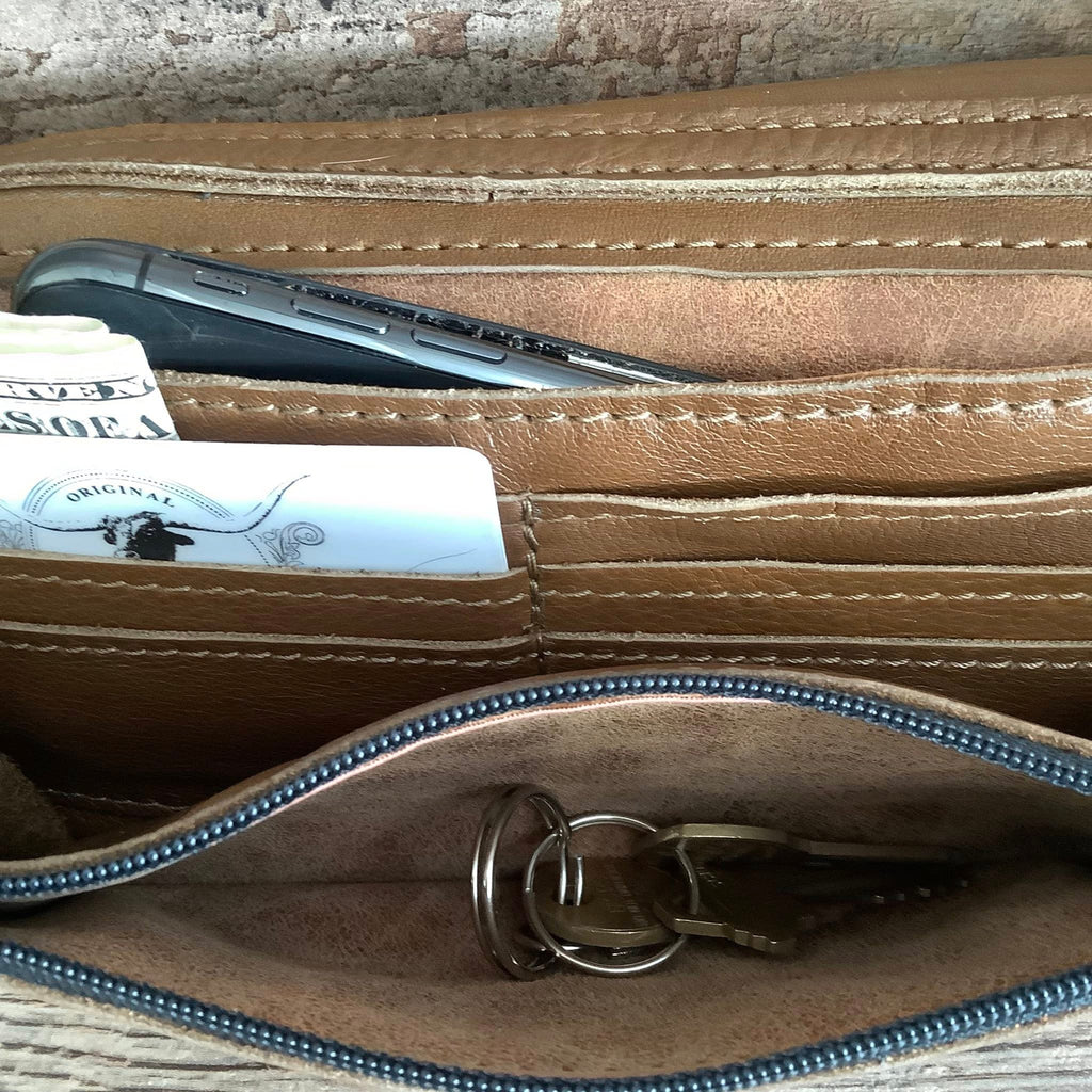 Our new wallet clutch crossbody named the Trail Boss is designed with versatility in mind for your convenient daily use. The Trail Boss has an adjustable strap and an elongated shape that opens to multiple compartments, including a zippered pocket.   Carry all of your daily essentials from your credit cards to your smart phone all together in this compact wallet clutch.