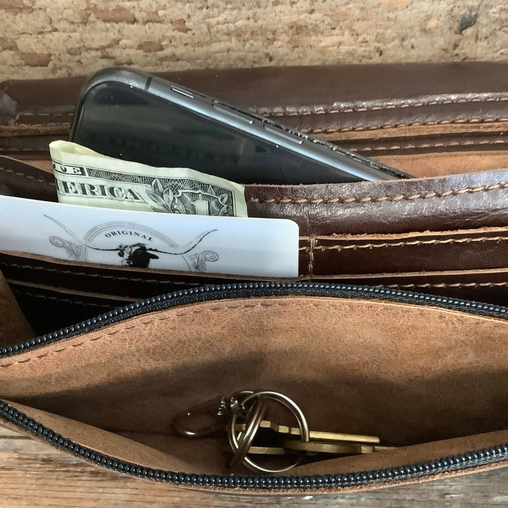 Our new wallet clutch crossbody named the Trail Boss is designed with versatility in mind for your convenient daily use. The Trail Boss has an adjustable strap and an elongated shape that opens to multiple compartments, including a zippered pocket.   Carry all of your daily essentials from your credit cards to your smart phone all together in this compact wallet clutch.