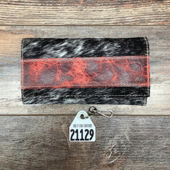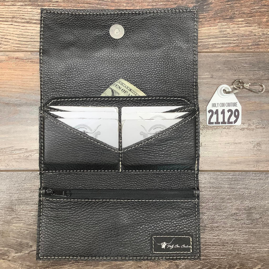 Our trifold wallet artfully combines timeless design along with practicality. Measuring 4” x 8”, it is perfectly sized to fit U.S. dollars, credit cards, checkbook, and passport and is secured with a magnetic closure for easy opening. It is available in natural hair on hide or embossed, two-tone leather. Its ample interior, fashioned from elegant full-grain leather, features numerous slots for cash and cards, as well as a zippered pocket for added safety. Add it to your HCC or give it as a gift to someone special.