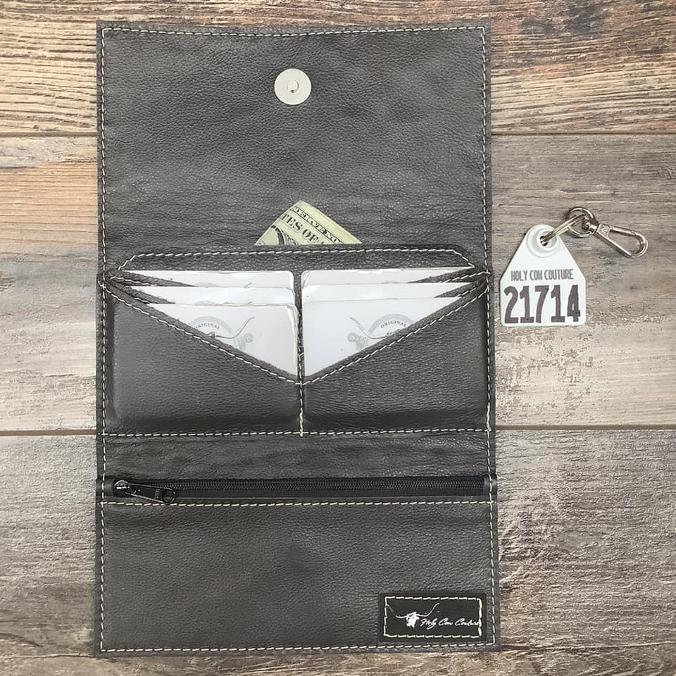 Our trifold wallet artfully combines timeless design along with practicality. Measuring 4” x 8”, it is perfectly sized to fit U.S. dollars, credit cards, checkbook, and passport and is secured with a magnetic closure for easy opening. It is available in natural hair on hide or embossed, two-tone leather. Its ample interior, fashioned from elegant full-grain leather, features numerous slots for cash and cards, as well as a zippered pocket for added safety. Add it to your HCC or give it as a gift to someone special.