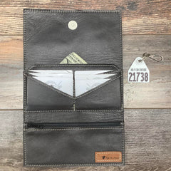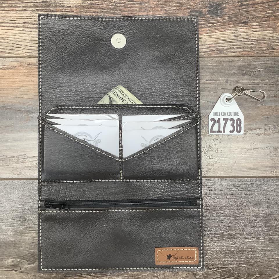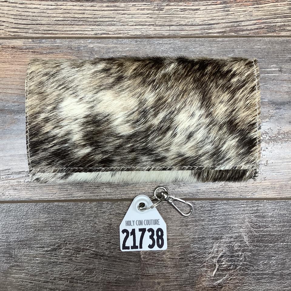 Our trifold wallet artfully combines timeless design along with practicality. Measuring 4” x 8”, it is perfectly sized to fit U.S. dollars, credit cards, checkbook, and passport and is secured with a magnetic closure for easy opening. It is available in natural hair on hide or embossed, two-tone leather. Its ample interior, fashioned from elegant full-grain leather, features numerous slots for cash and cards, as well as a zippered pocket for added safety. Add it to your HCC or give it as a gift to someone special.