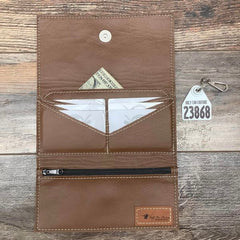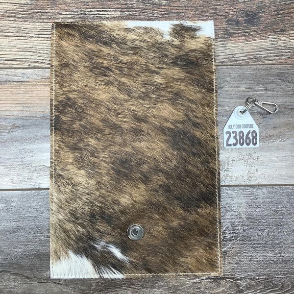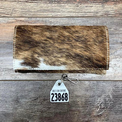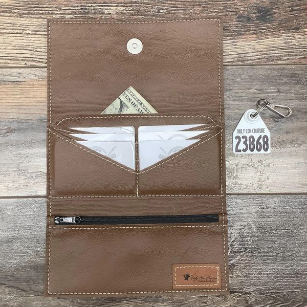 Our trifold wallet artfully combines timeless design along with practicality. Measuring 4” x 8”, it is perfectly sized to fit U.S. dollars, credit cards, checkbook, and passport and is secured with a magnetic closure for easy opening. It is available in natural hair on hide or embossed, two-tone leather. Its ample interior, fashioned from elegant full-grain leather, features numerous slots for cash and cards, as well as a zippered pocket for added safety. Add it to your HCC or give it as a gift to someone special.