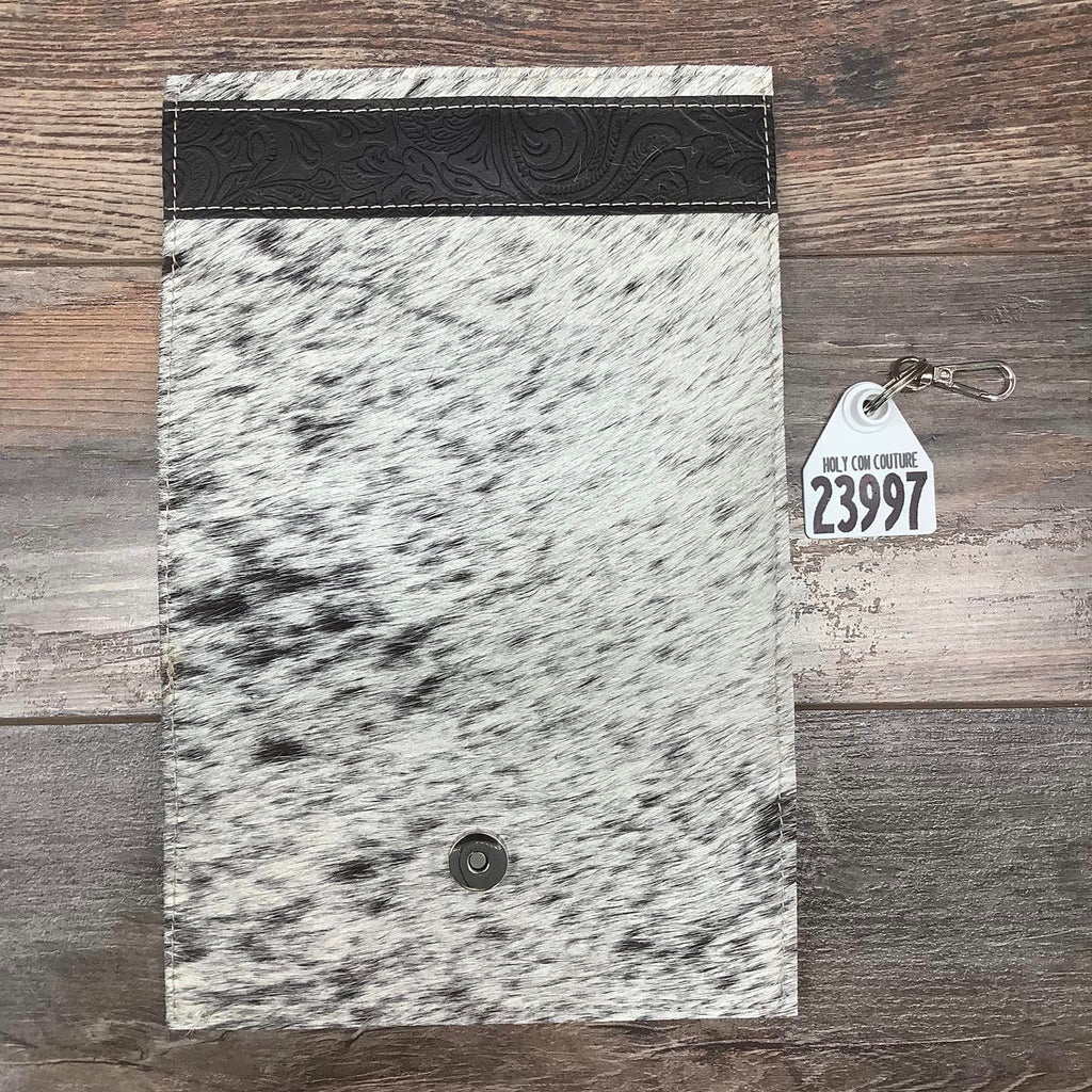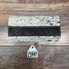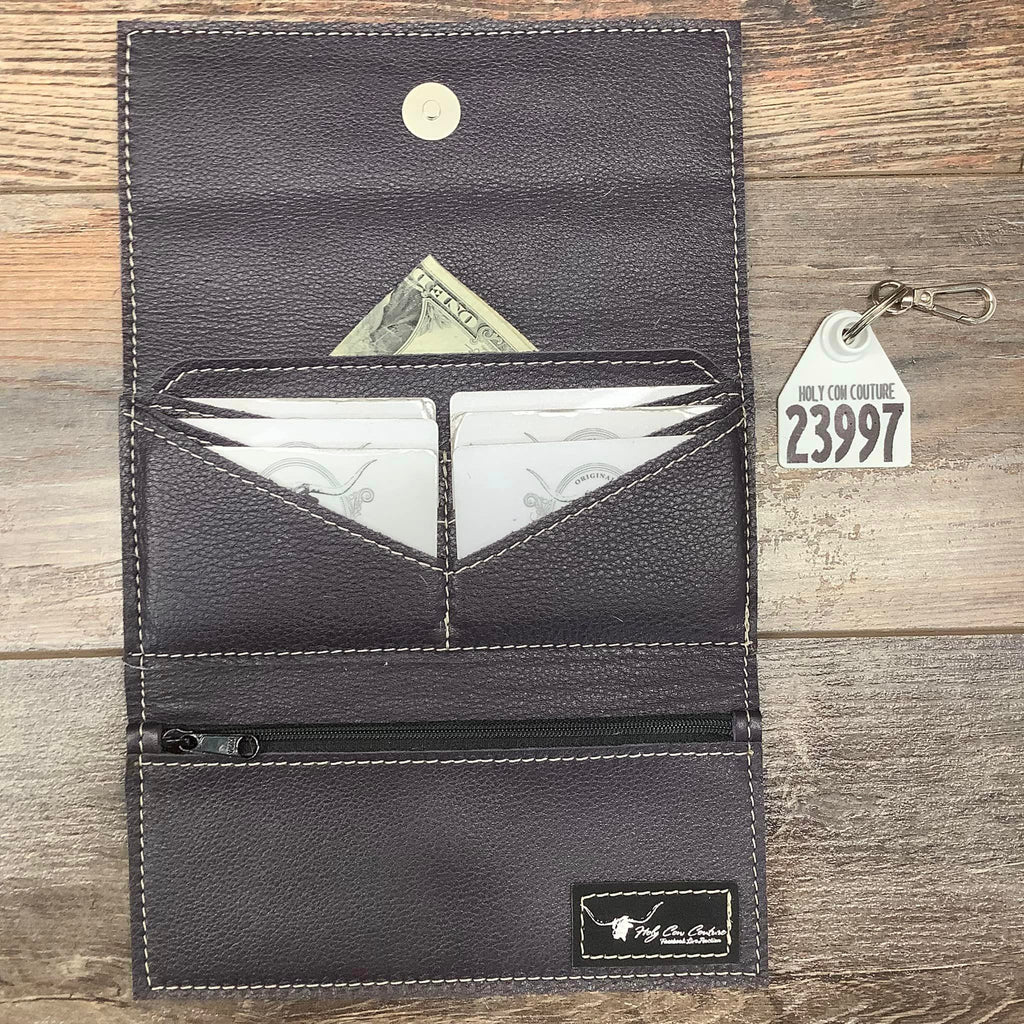Our trifold wallet artfully combines timeless design along with practicality. Measuring 4” x 8”, it is perfectly sized to fit U.S. dollars, credit cards, checkbook, and passport and is secured with a magnetic closure for easy opening. It is available in natural hair on hide or embossed, two-tone leather. Its ample interior, fashioned from elegant full-grain leather, features numerous slots for cash and cards, as well as a zippered pocket for added safety. Add it to your HCC or give it as a gift to someone special.