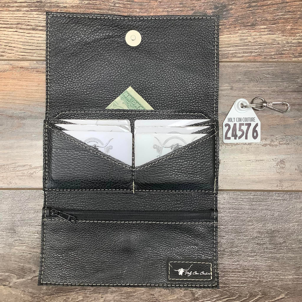 Our trifold wallet artfully combines timeless design along with practicality. Measuring 4” x 8”, it is perfectly sized to fit U.S. dollars, credit cards, checkbook, and passport and is secured with a magnetic closure for easy opening. It is available in natural hair on hide or embossed, two-tone leather. Its ample interior, fashioned from elegant full-grain leather, features numerous slots for cash and cards, as well as a zippered pocket for added safety. Add it to your HCC or give it as a gift to someone special.