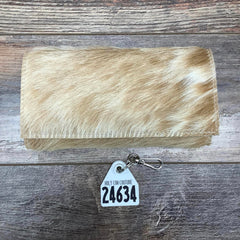 Our trifold wallet artfully combines timeless design along with practicality. Measuring 4” x 8”, it is perfectly sized to fit U.S. dollars, credit cards, checkbook, and passport and is secured with a magnetic closure for easy opening. It is available in natural hair on hide or embossed, two-tone leather. Its ample interior, fashioned from elegant full-grain leather, features numerous slots for cash and cards, as well as a zippered pocket for added safety. Add it to your HCC or give it as a gift to someone special.