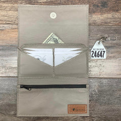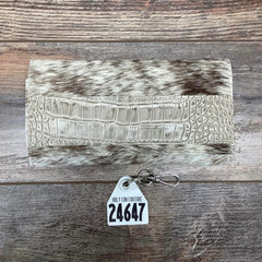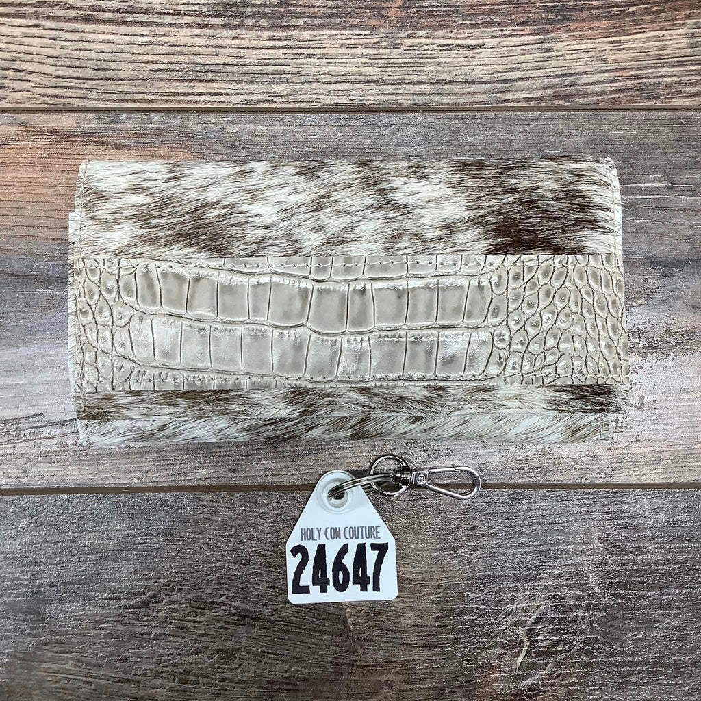 Our trifold wallet artfully combines timeless design along with practicality. Measuring 4” x 8”, it is perfectly sized to fit U.S. dollars, credit cards, checkbook, and passport and is secured with a magnetic closure for easy opening. It is available in natural hair on hide or embossed, two-tone leather. Its ample interior, fashioned from elegant full-grain leather, features numerous slots for cash and cards, as well as a zippered pocket for added safety. Add it to your HCC or give it as a gift to someone special.