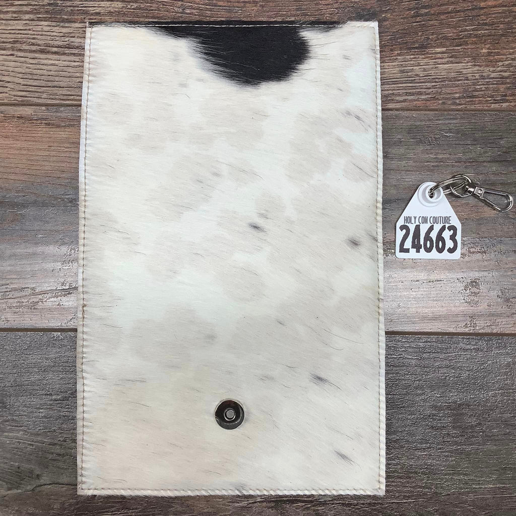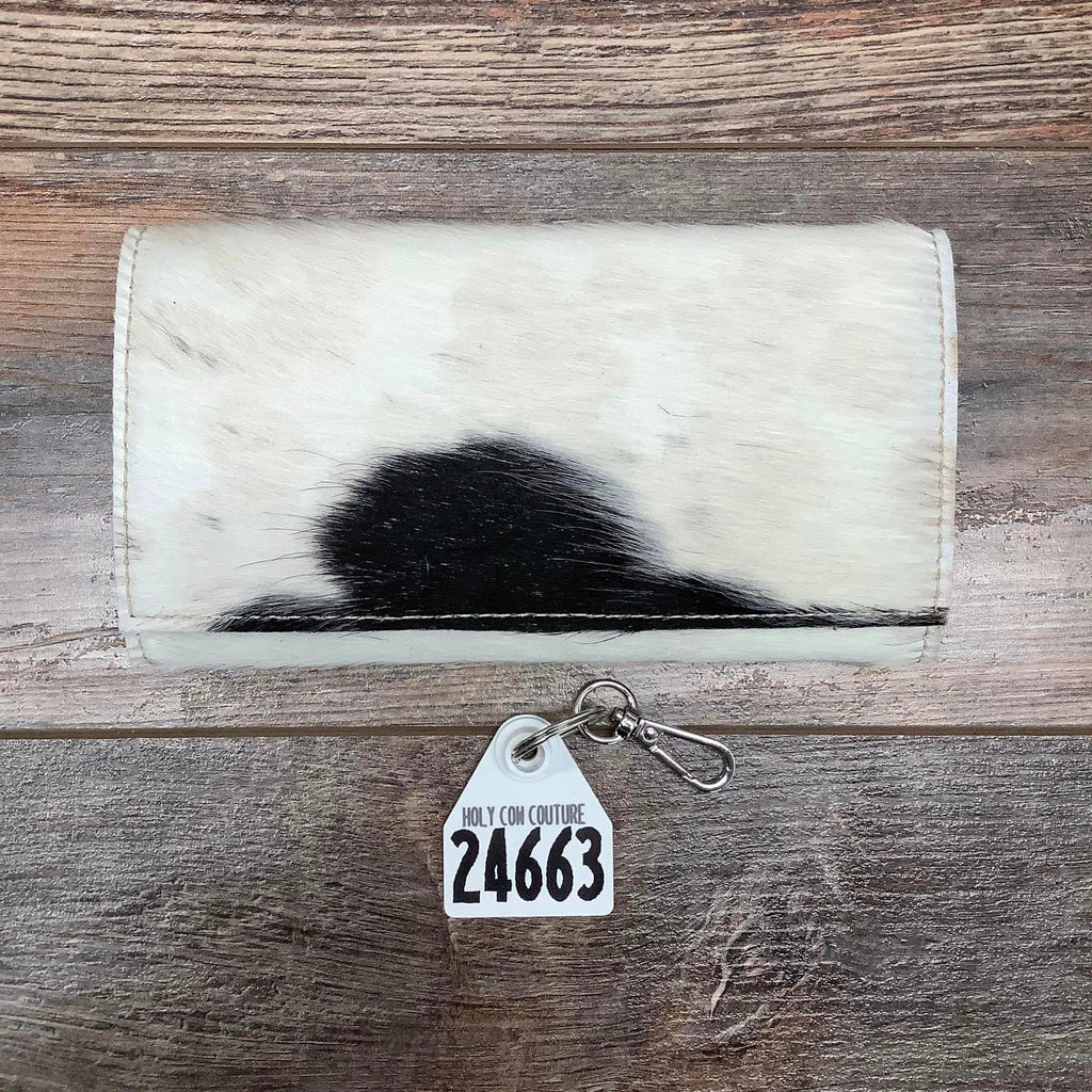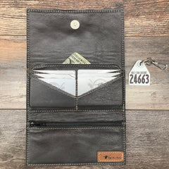 Our trifold wallet artfully combines timeless design along with practicality. Measuring 4” x 8”, it is perfectly sized to fit U.S. dollars, credit cards, checkbook, and passport and is secured with a magnetic closure for easy opening. It is available in natural hair on hide or embossed, two-tone leather. Its ample interior, fashioned from elegant full-grain leather, features numerous slots for cash and cards, as well as a zippered pocket for added safety. Add it to your HCC or give it as a gift to someone special.