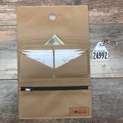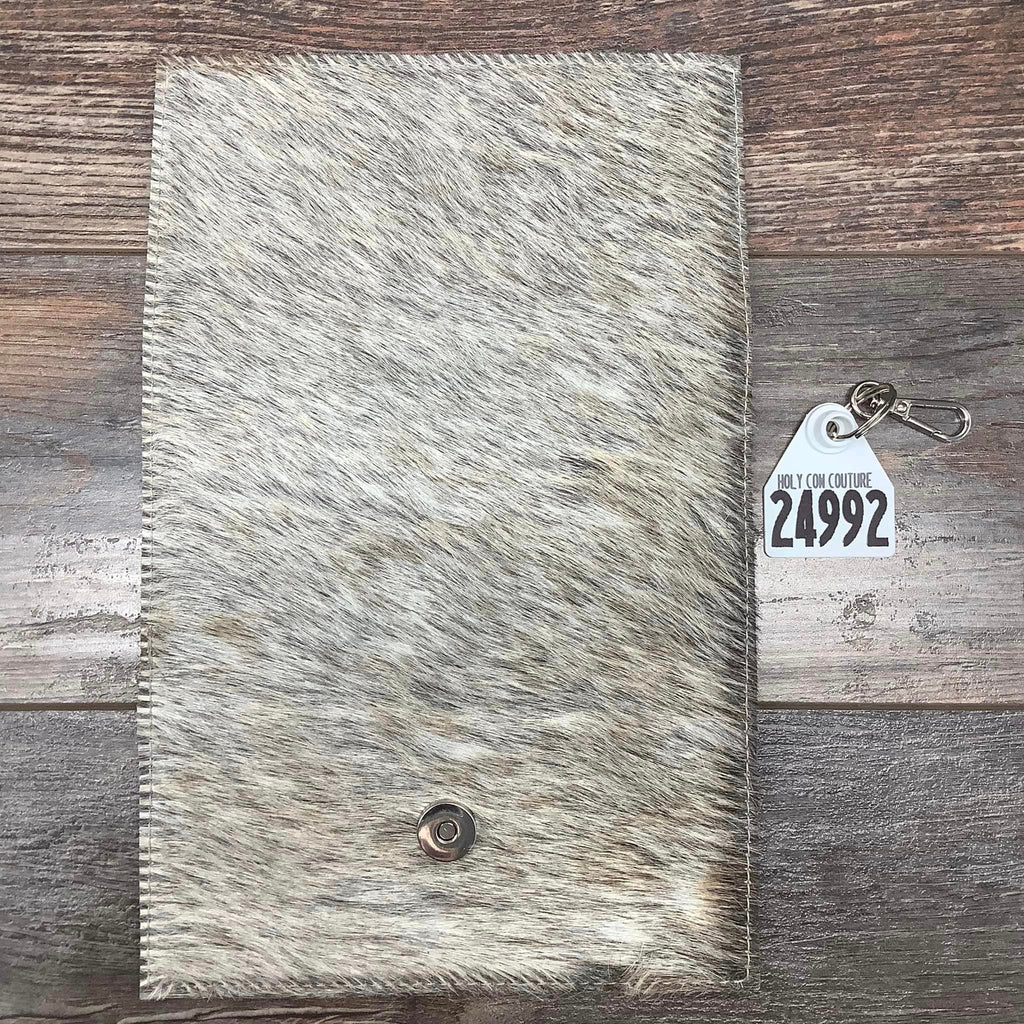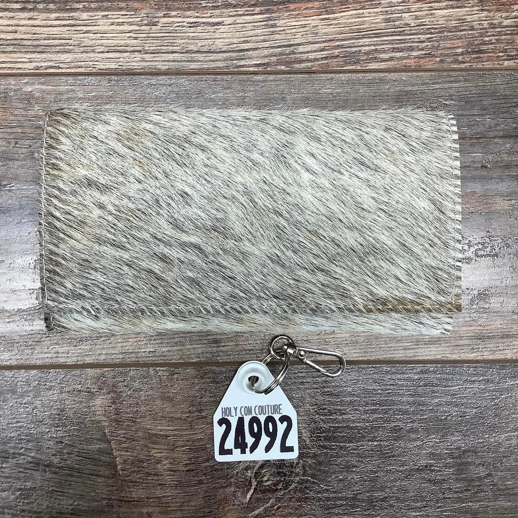 Our trifold wallet artfully combines timeless design along with practicality. Measuring 4” x 8”, it is perfectly sized to fit U.S. dollars, credit cards, checkbook, and passport and is secured with a magnetic closure for easy opening. It is available in natural hair on hide or embossed, two-tone leather. Its ample interior, fashioned from elegant full-grain leather, features numerous slots for cash and cards, as well as a zippered pocket for added safety. Add it to your HCC or give it as a gift to someone special.