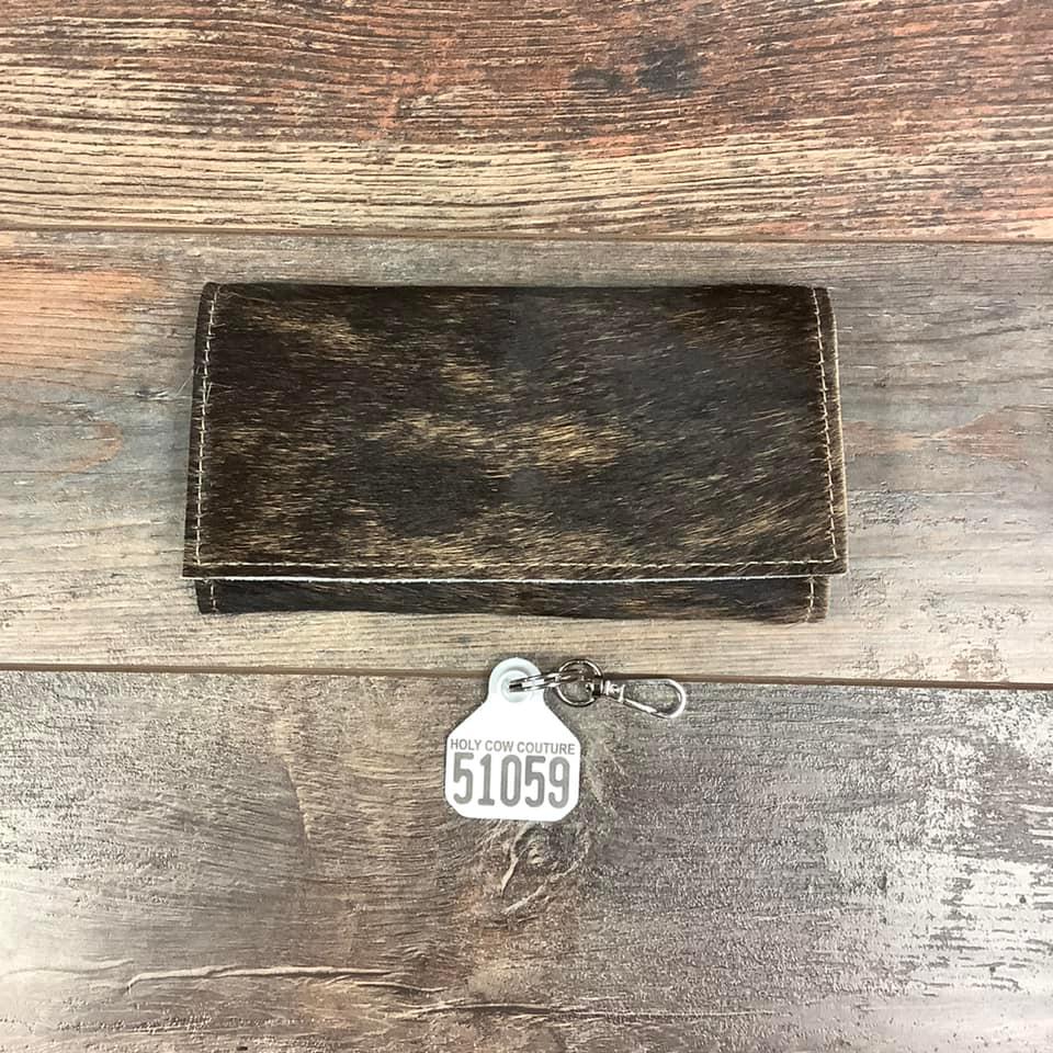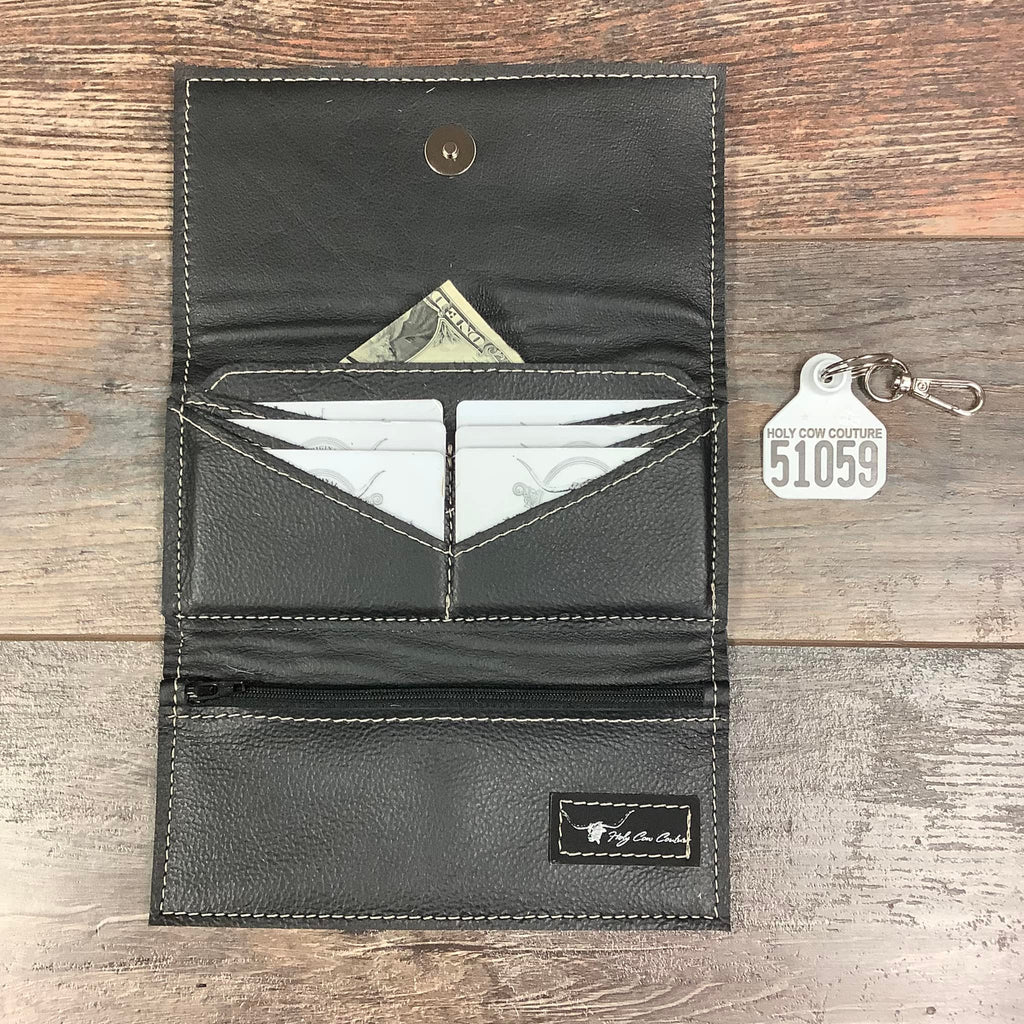 Our trifold wallet artfully combines timeless design along with practicality. Measuring 4” x 8”, it is perfectly sized to fit U.S. dollars, credit cards, checkbook, and passport and is secured with a magnetic closure for easy opening. It is available in natural hair on hide or embossed, two-tone leather. Its ample interior, fashioned from elegant full-grain leather, features numerous slots for cash and cards, as well as a zippered pocket for added safety. Add it to your HCC or give it as a gift to someone special.