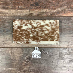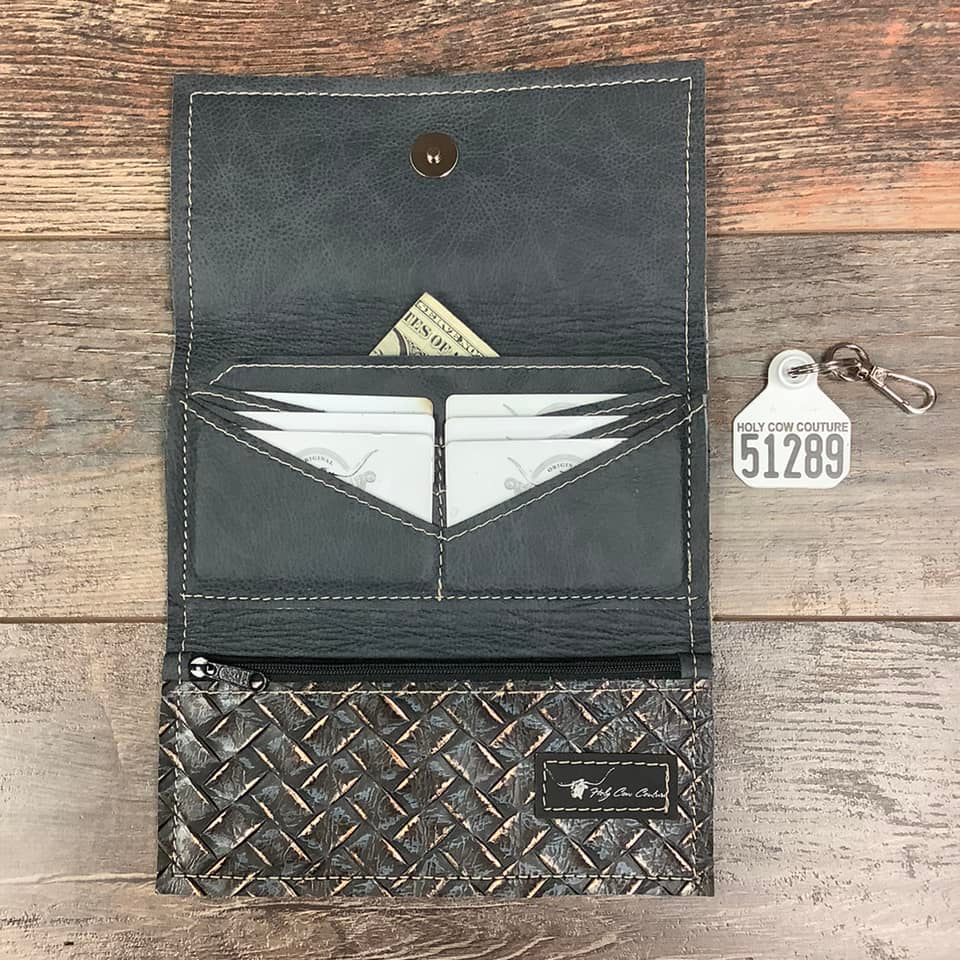Our trifold wallet artfully combines timeless design along with practicality. Measuring 4” x 8”, it is perfectly sized to fit U.S. dollars, credit cards, checkbook, and passport and is secured with a magnetic closure for easy opening. It is available in natural hair on hide or embossed, two-tone leather. Its ample interior, fashioned from elegant full-grain leather, features numerous slots for cash and cards, as well as a zippered pocket for added safety. Add it to your HCC or give it as a gift to someone special.
