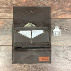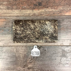 Our trifold wallet artfully combines timeless design along with practicality. Measuring 4” x 8”, it is perfectly sized to fit U.S. dollars, credit cards, checkbook, and passport and is secured with a magnetic closure for easy opening. It is available in natural hair on hide or embossed, two-tone leather. Its ample interior, fashioned from elegant full-grain leather, features numerous slots for cash and cards, as well as a zippered pocket for added safety. Add it to your HCC or give it as a gift to someone special.