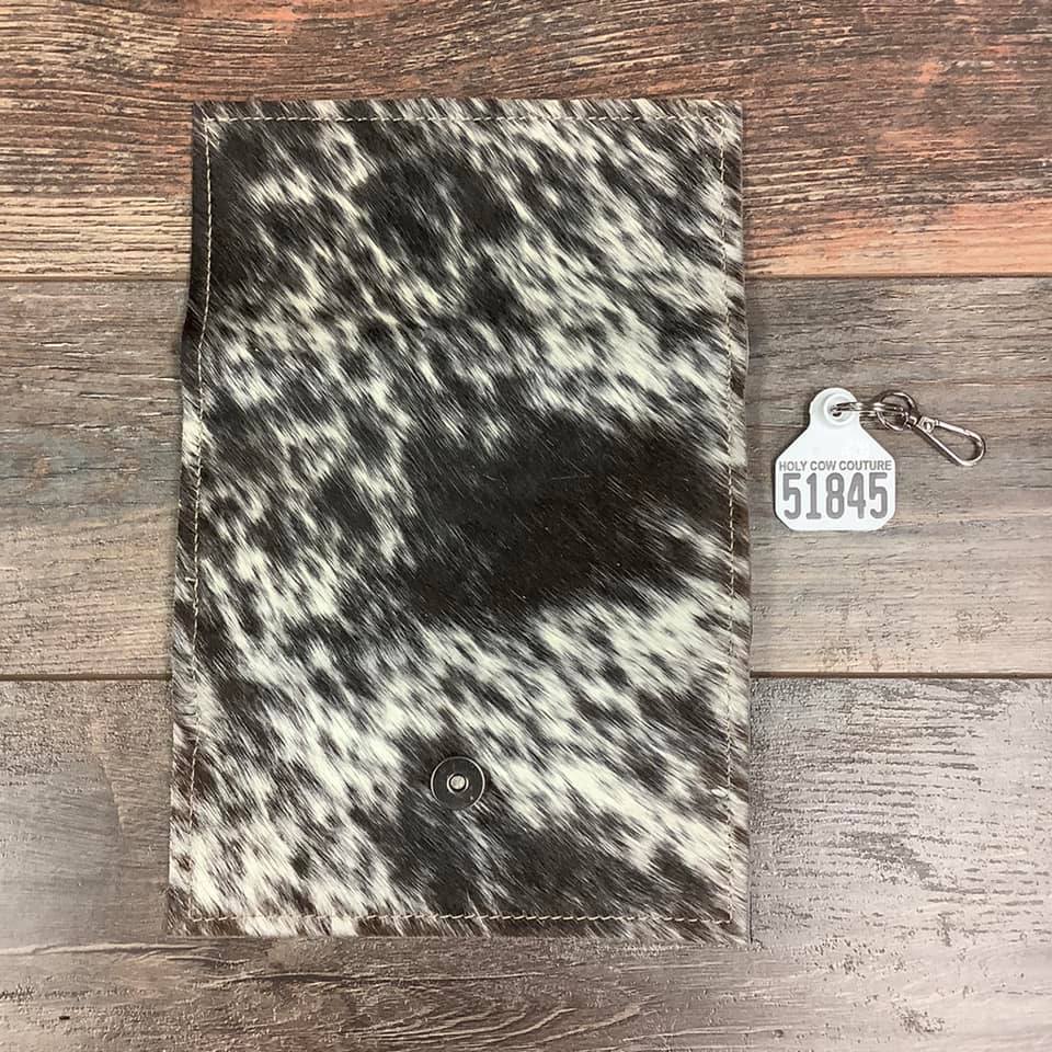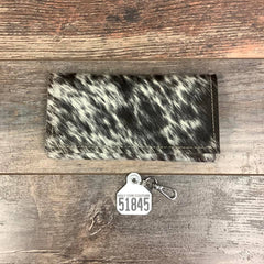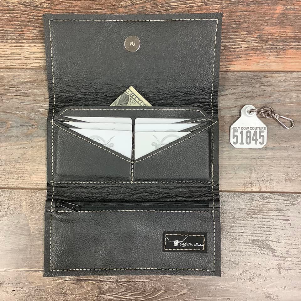 Our trifold wallet artfully combines timeless design along with practicality. Measuring 4” x 8”, it is perfectly sized to fit U.S. dollars, credit cards, checkbook, and passport and is secured with a magnetic closure for easy opening. It is available in natural hair on hide or embossed, two-tone leather. Its ample interior, fashioned from elegant full-grain leather, features numerous slots for cash and cards, as well as a zippered pocket for added safety. Add it to your HCC or give it as a gift to someone special.