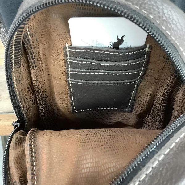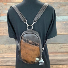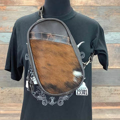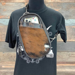 The Bum Pack!  The chic and versatile bag for the fashion-conscious cowgirl on the go!  The Bum Pack features a sleek design with a front panel crafted from genuine cowhide or genuine embossed leather.  The surrounding leather in rich colors adds a touch of sophistication and durability. Its compact size makes it perfect for carrying essentials like your phone, wallet, and keys, while keeping your hands free. The adjustable leather straps offer comfort and convenience, allowing you to wear it as a backpack, over your shoulder or as a crossbody.  Whether you're navigating the rodeo, a music festival or exploring the city, the Bum Pack combines practicality with an edge of rustic elegance.
