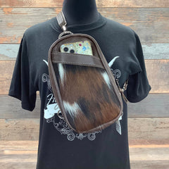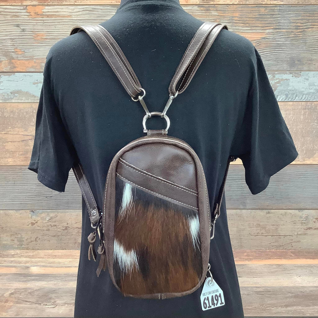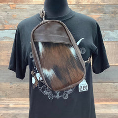 The Bum Pack!  The chic and versatile bag for the fashion-conscious cowgirl on the go!  The Bum Pack features a sleek design with a front panel crafted from genuine cowhide or genuine embossed leather.  The surrounding leather in rich colors adds a touch of sophistication and durability. Its compact size makes it perfect for carrying essentials like your phone, wallet, and keys, while keeping your hands free. The adjustable leather straps offer comfort and convenience, allowing you to wear it as a backpack, over your shoulder or as a crossbody.  Whether you're navigating the rodeo, a music festival or exploring the city, the Bum Pack combines practicality with an edge of rustic elegance.