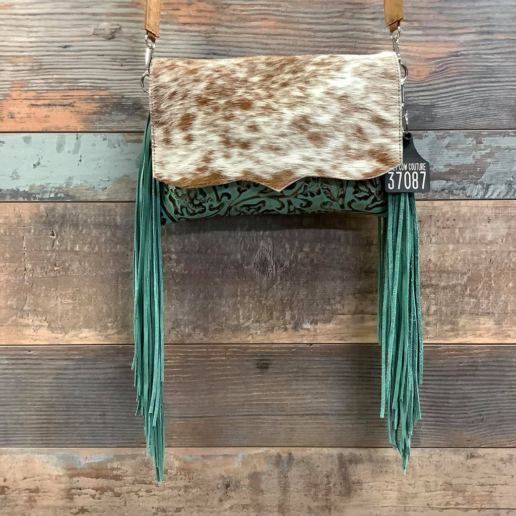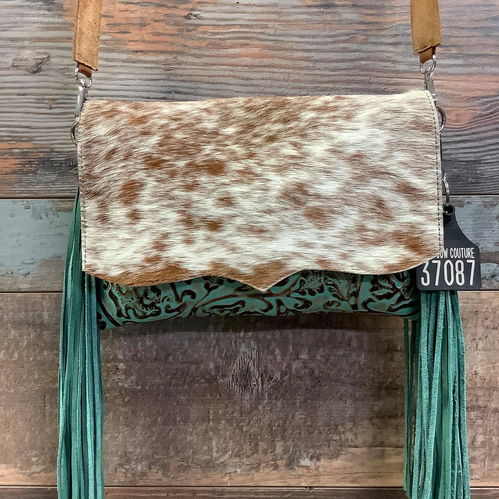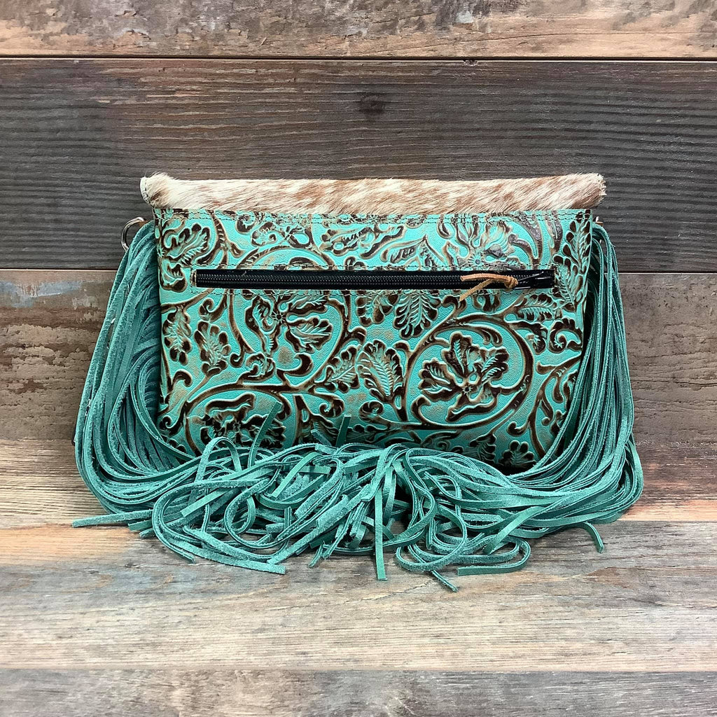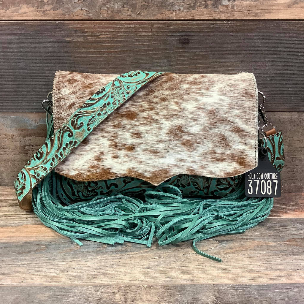 Our Classy Cowgirl is a real head turner. This classy, fringed fold over handbag can be hung casually over your shoulder or used as a clutch for a special evening out. Its many attractive details include an adjustable strap, zippered outside back pouch, exotic embossed leather trim and jewel-like silver metal beading. The front flap with a gently curved edge is made from natural hair-on hide, while the back is crafted from elegant pebbled full-grain leather to prevent rubbing.