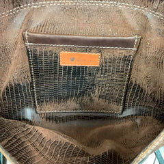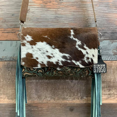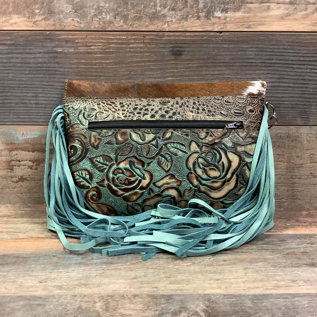 Our Classy Cowgirl is a real head turner. This classy, fringed fold over handbag can be hung casually over your shoulder or used as a clutch for a special evening out. Its many attractive details include an adjustable strap, zippered outside back pouch, exotic embossed leather trim and jewel-like silver metal beading. The front flap with a gently curved edge is made from natural hair-on hide, while the back is crafted from elegant pebbled full-grain leather to prevent rubbing.