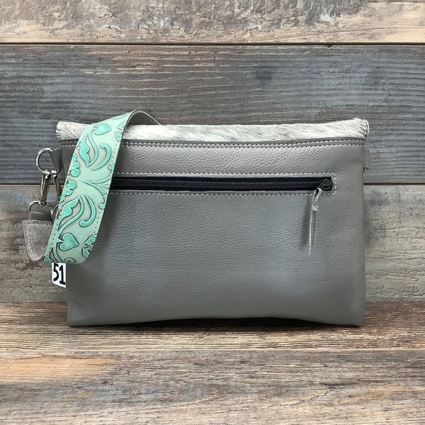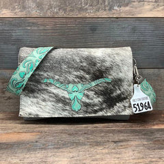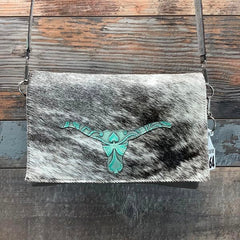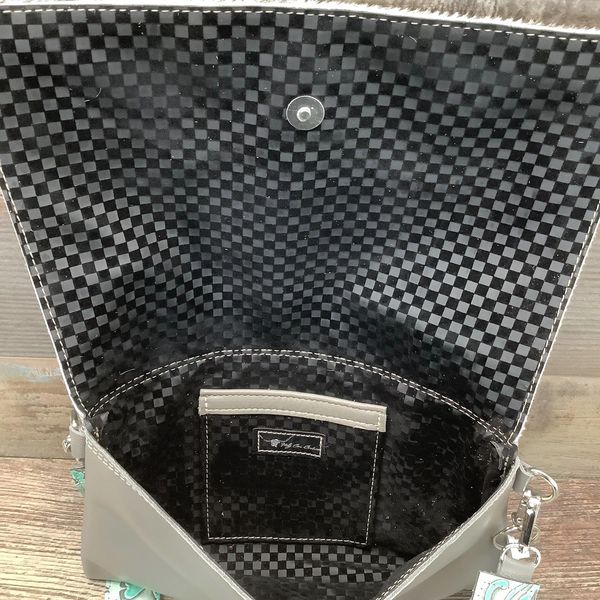 Our Classy Cowgirl is a real head turner. This classy, fringed fold over handbag can be hung casually over your shoulder or used as a clutch for a special evening out. Its many attractive details include an adjustable strap, zippered outside back pouch, exotic embossed leather trim and jewel-like silver metal beading. The front flap with a gently curved edge is made from natural hair-on hide, while the back is crafted from elegant pebbled full-grain leather to prevent rubbing.