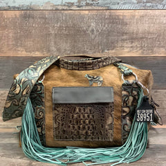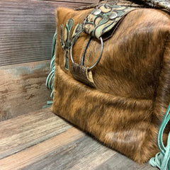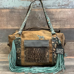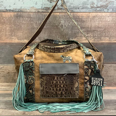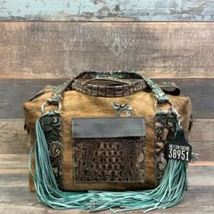 Our Denton Duffle is perfect for a flight carry-on, overnight, rodeo, or gym bag. It's designed with two sturdy strap choices, a long removable shoulder strap with suede underneath, for a non-slip function, and grab and go handles.  This duffle is lined with fabric and has 2 interior pockets.  There are 1 or 2 exterior zipper closer pockets for convenient quick access.
