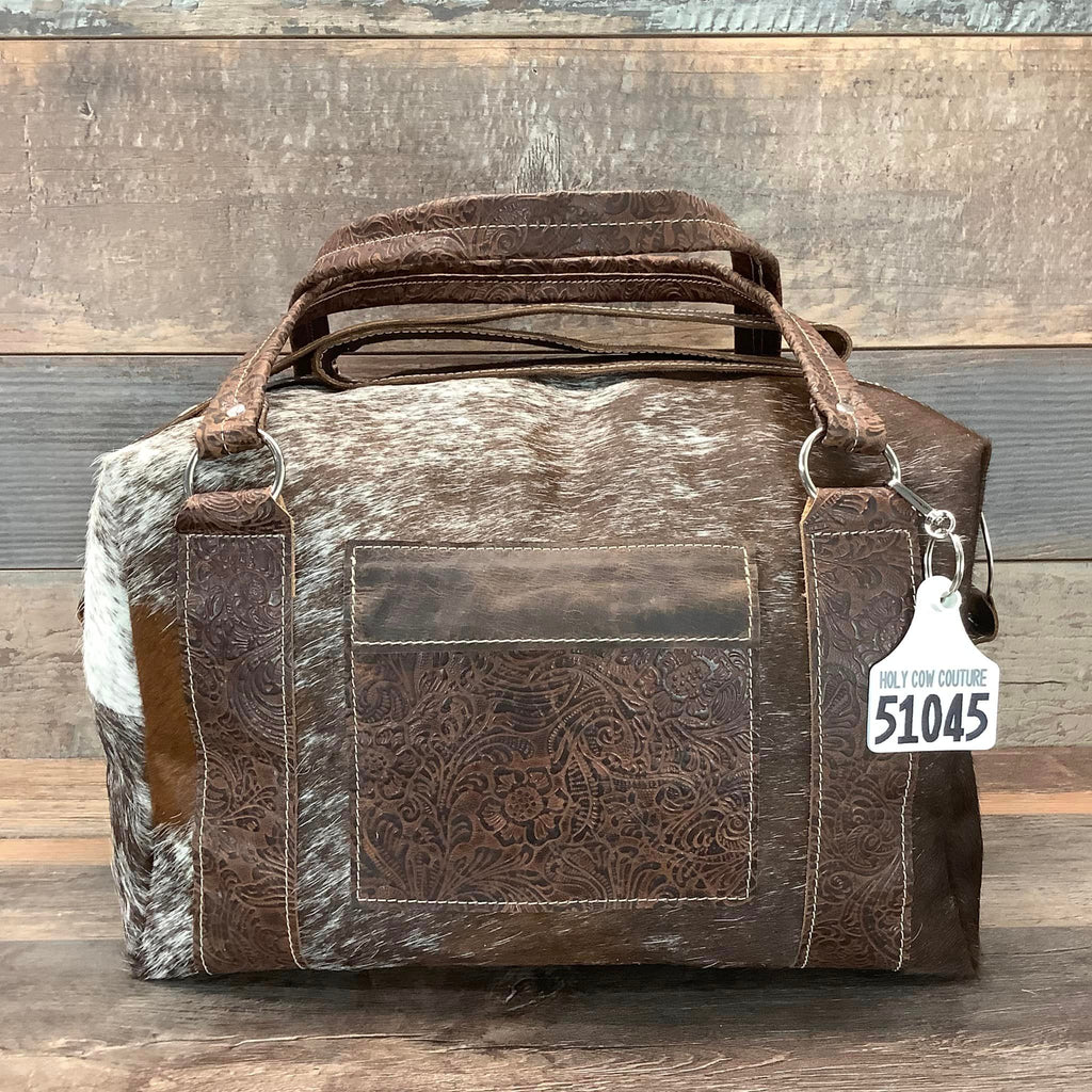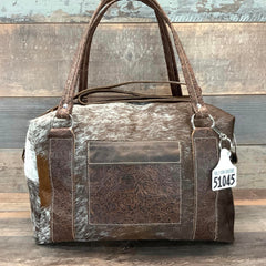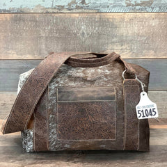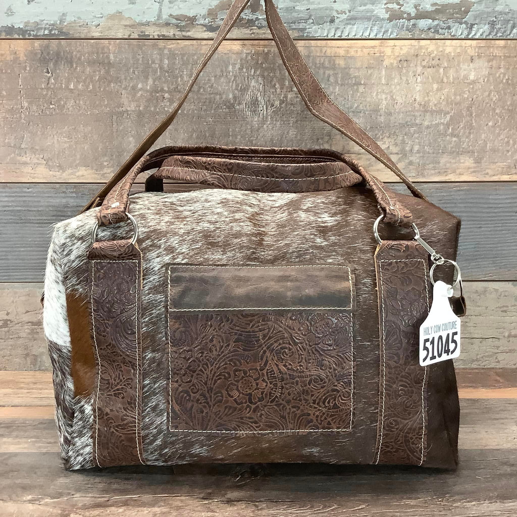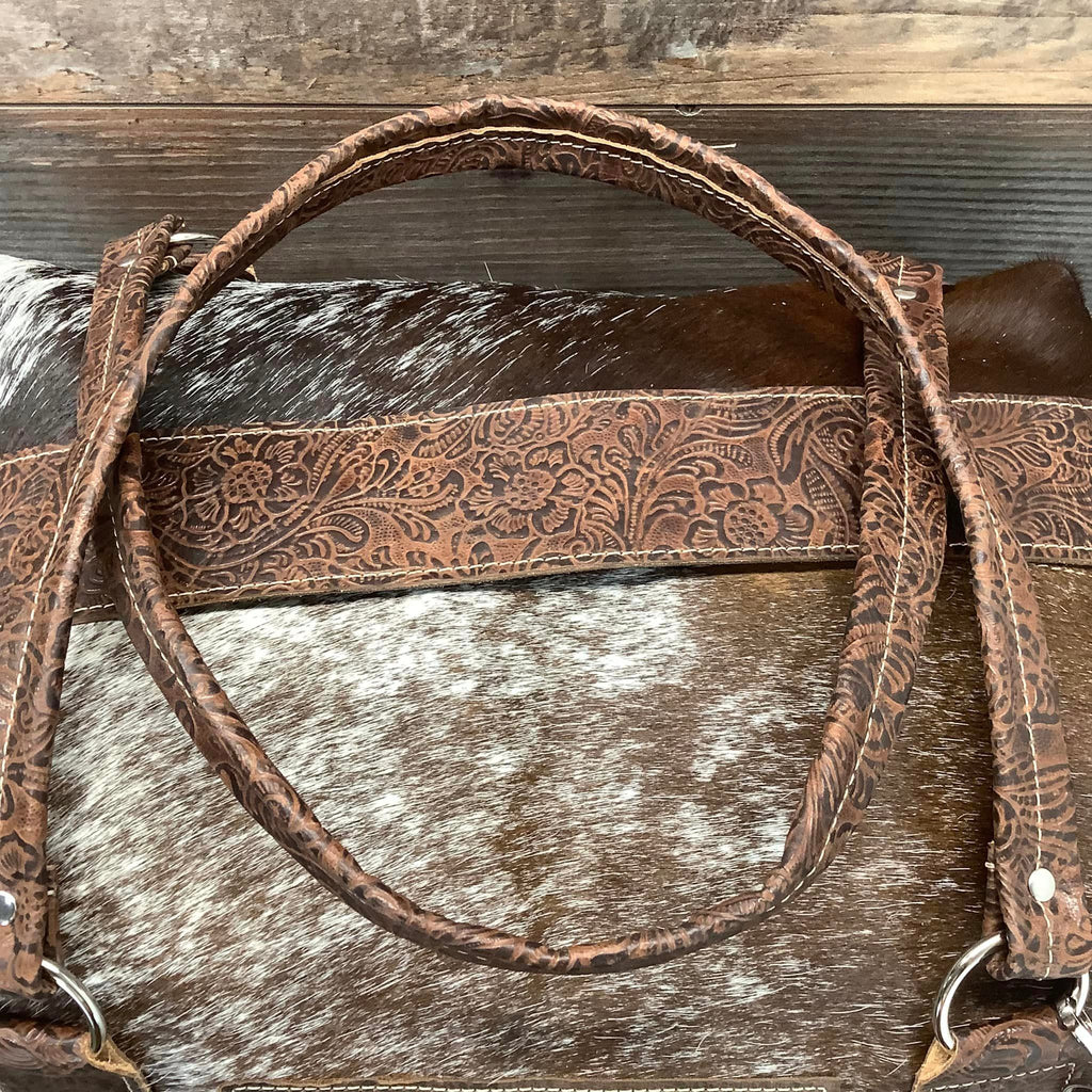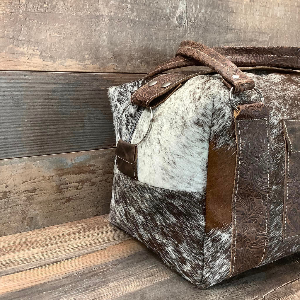 Our Denton Duffle is perfect for a flight carry-on, overnight, rodeo, or gym bag. It's designed with two sturdy strap choices, a long removable shoulder strap with suede underneath, for a non-slip function, and grab and go handles.  This duffle is lined with fabric and has 2 interior pockets.  There are 1 or 2 exterior zipper closer pockets for convenient quick access.