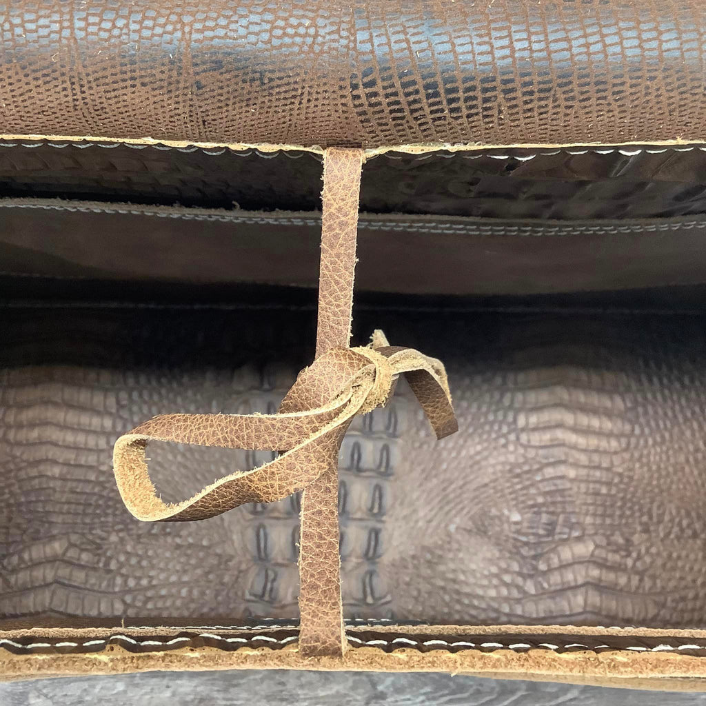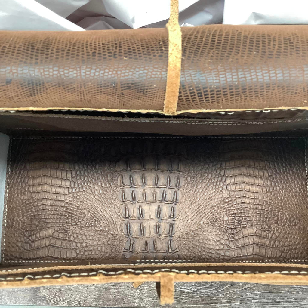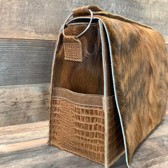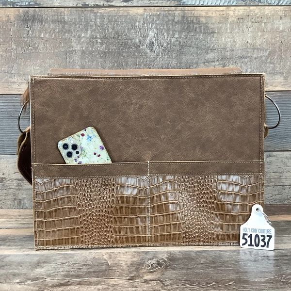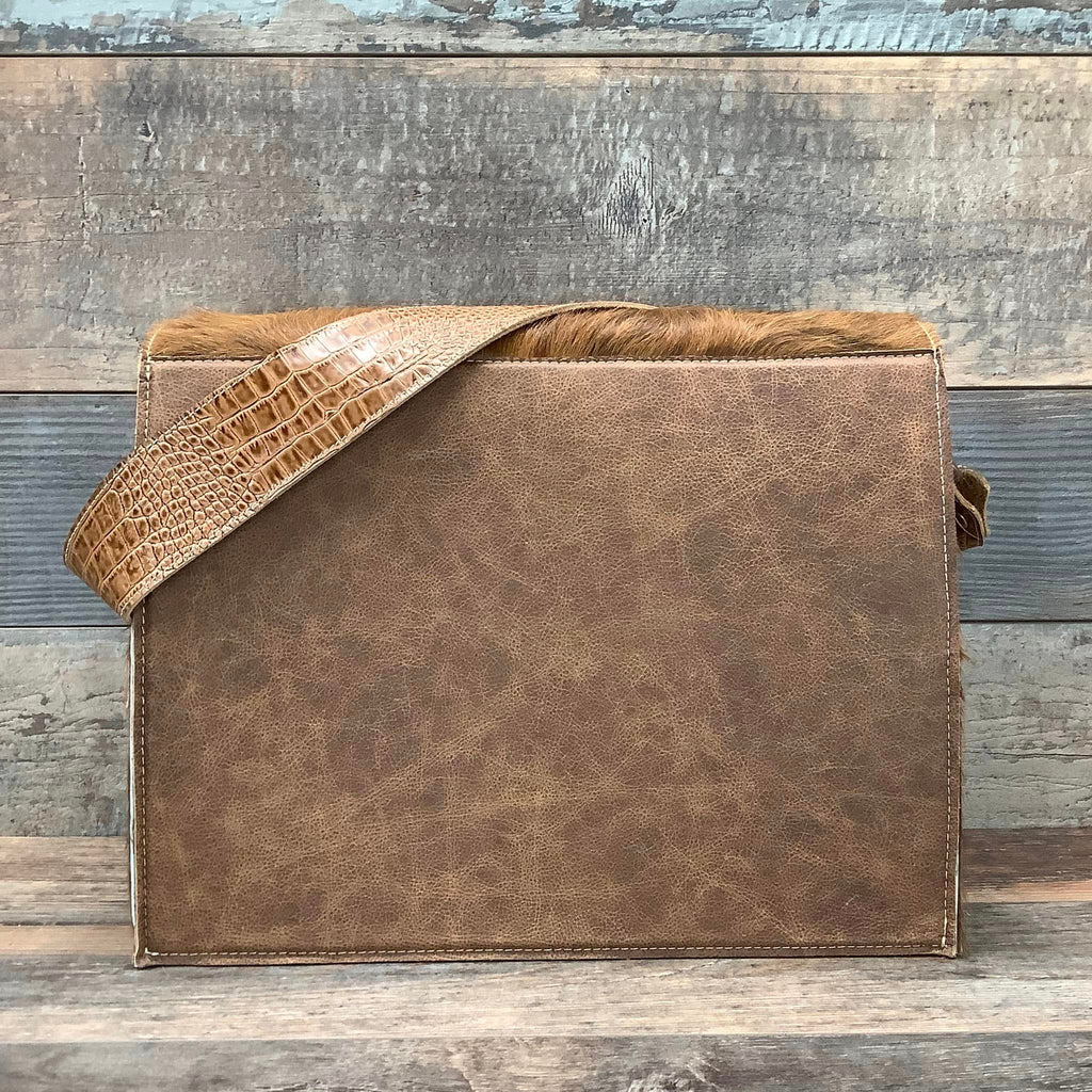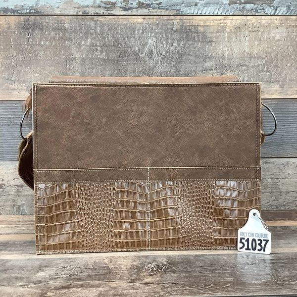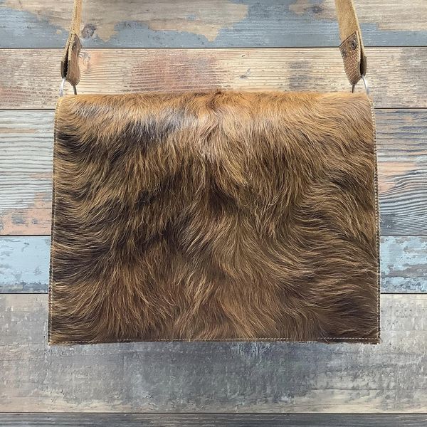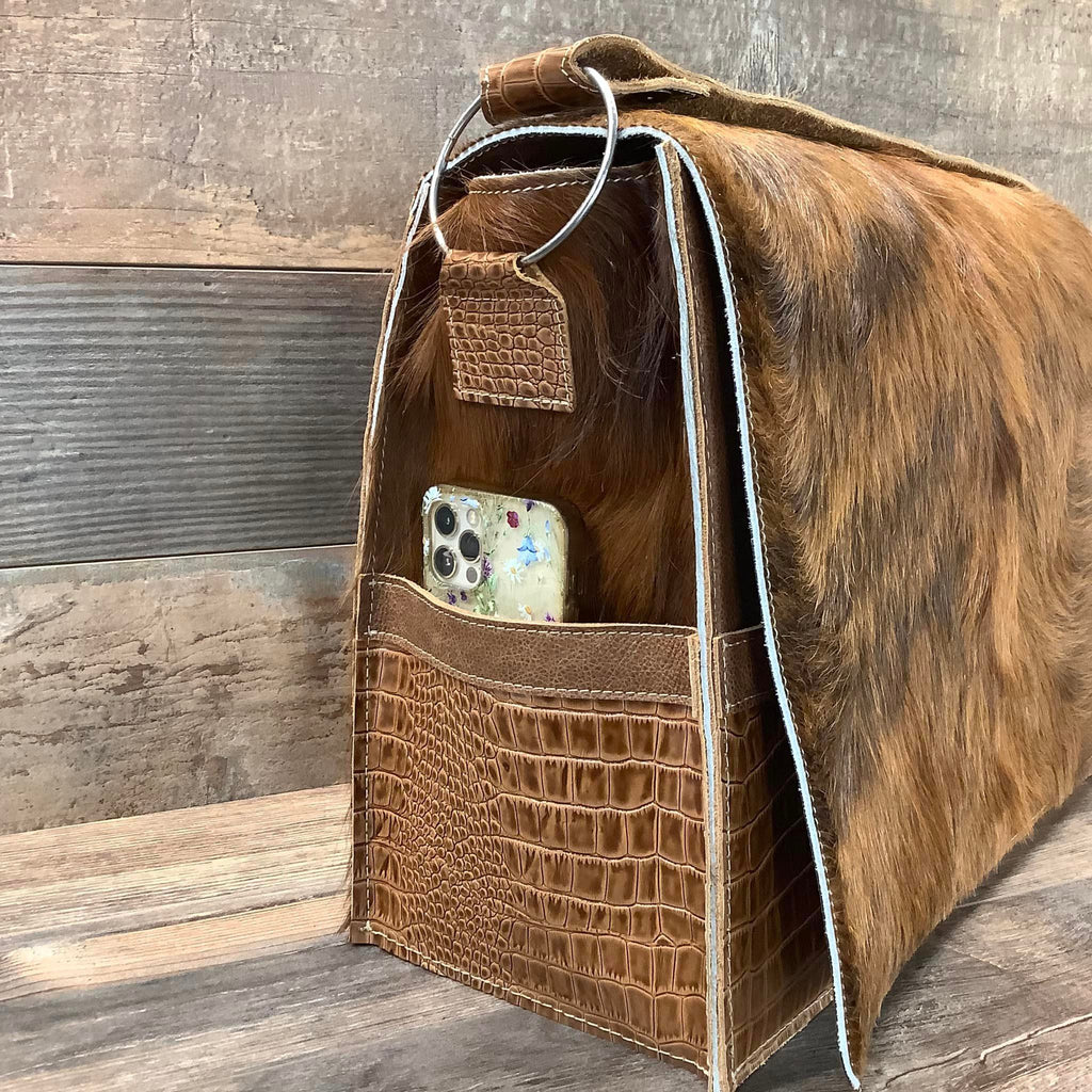 This classic HCC bag is known as our Diaper Bag, although, this bag has many uses. An amazing fashionable tote to use as a diaper bag, camera bag, school bag, or business bag. It is comfortable to carry without compromising your style. It has a beautiful premium hair on hide flap.The long shoulder strap is 36” long and 2.5” wide embossed leather for beauty and style, suede on the underneath for a strong grip for non-ship function .  This bag has 2 exterior front pockets and 2 exterior side pockets and 4 interior pockets. Our stylish faux leather lines the interior for easy clean up. The front, back, and bottom has stiffener to keep the bag upright and structured.