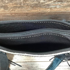 The Double Barrel is like the sister to our sling shot with more room and compartments for your belongs! It features 2 zipper top pockets with a center leather opening (pocket) for easy access to your phone, receipts, money etc..