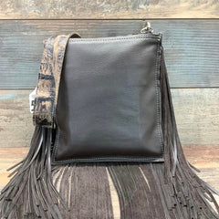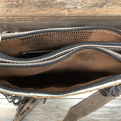 The Double Barrel is like the sister to our sling shot with more room and compartments for your belongs! It features 2 zipper top pockets with a center leather opening (pocket) for easy access to your phone, receipts, money etc..