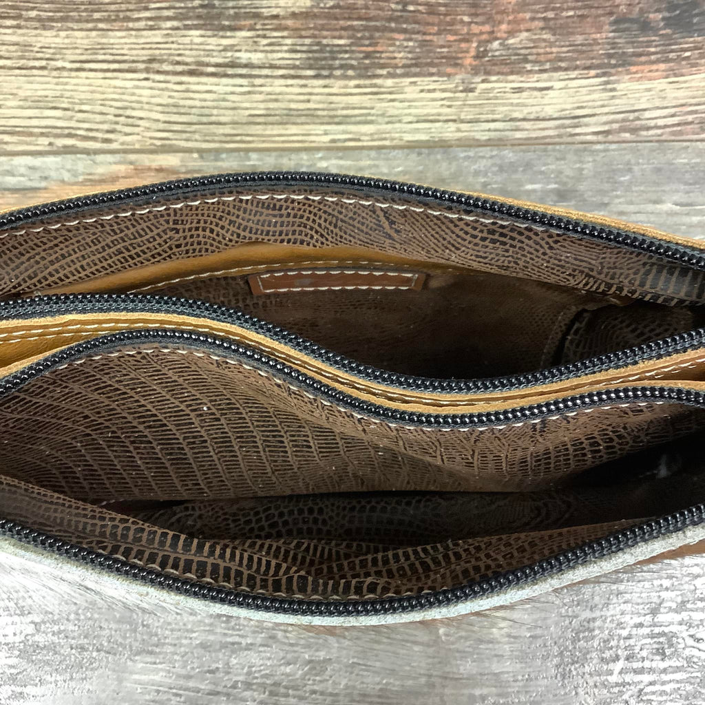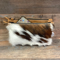 The two-in-one style Double Ranch Hand is smart and classy. Compact and convenient, it is the perfect handbag if you’re traveling light: just the right size for your cell phone, keys and wallet. It features two leather straps, a removable wristlet and crossbody strap, and a fabric-lined interior pocket. The front is covered in natural hair-on cow or deer hide, and the back in sleek black leather to prevent rubbing. Grab it to look sharp on a girls’ night out.