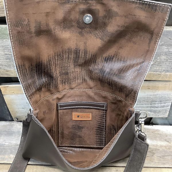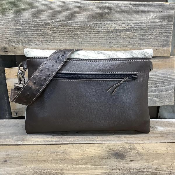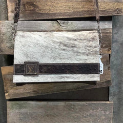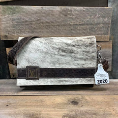 Our Classy Cowgirl is a real head turner. This classy, fringed fold over handbag can be hung casually over your shoulder or used as a clutch for a special evening out. Its many attractive details include an adjustable strap, zippered outside back pouch, exotic embossed leather trim and jewel-like silver metal beading. The front flap with a gently curved edge is made from natural hair-on hide, while the back is crafted from elegant pebbled full-grain leather to prevent rubbing.