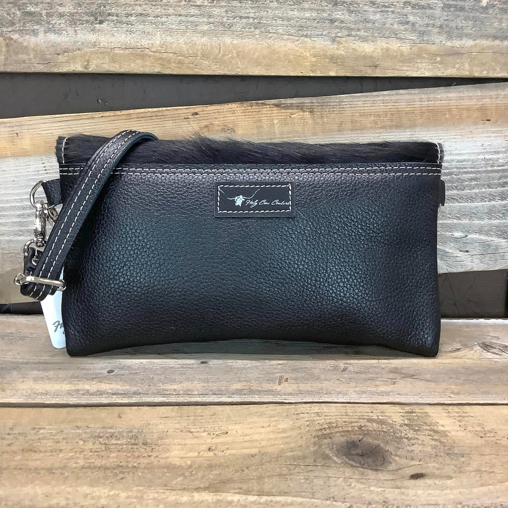 Our Sassy Mini Classy Cowgirl is a mini version of our Classy Cowgirl. This classy, fold over handbag can be hung casually over your shoulder or used as a clutch for a special evening out. The front flap with a gently curved edge is made from natural hair-on hide, while the back is crafted from elegant pebbled full-grain leather to prevent rubbing.