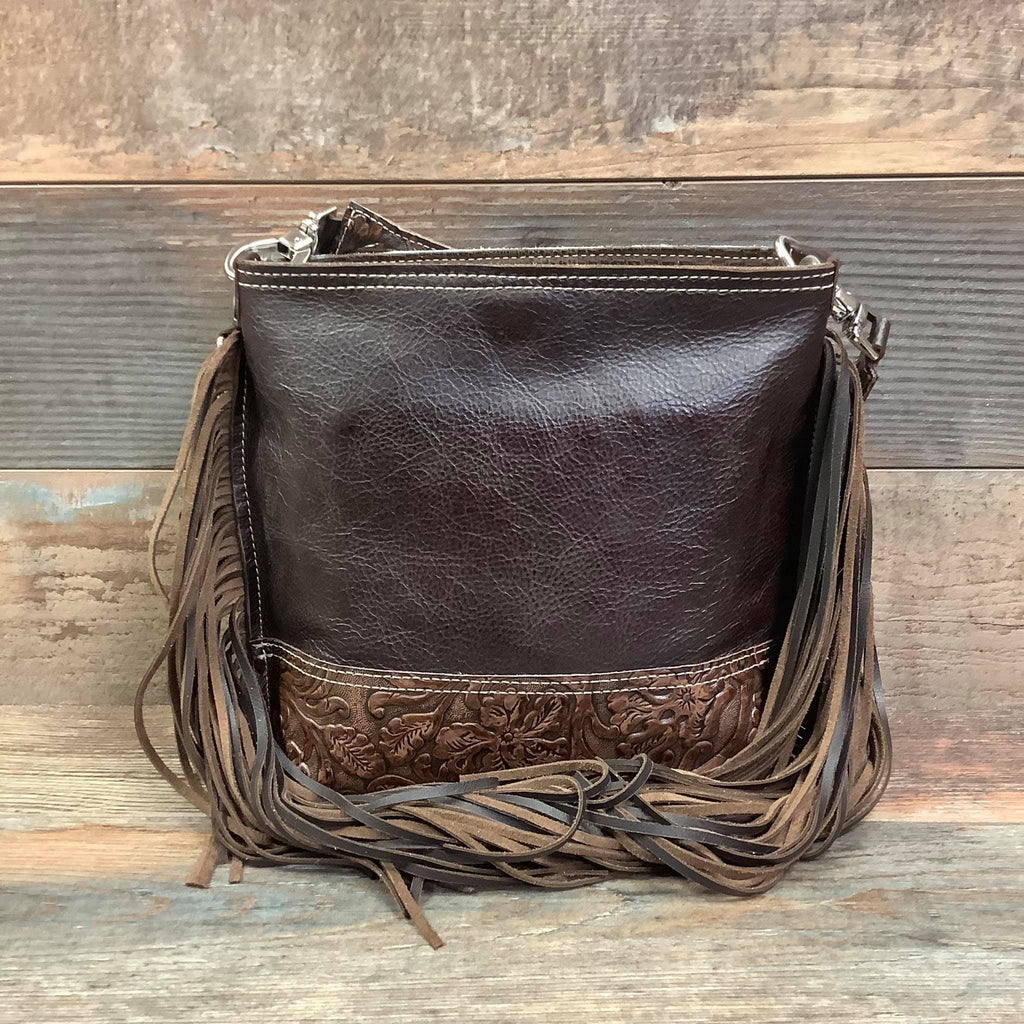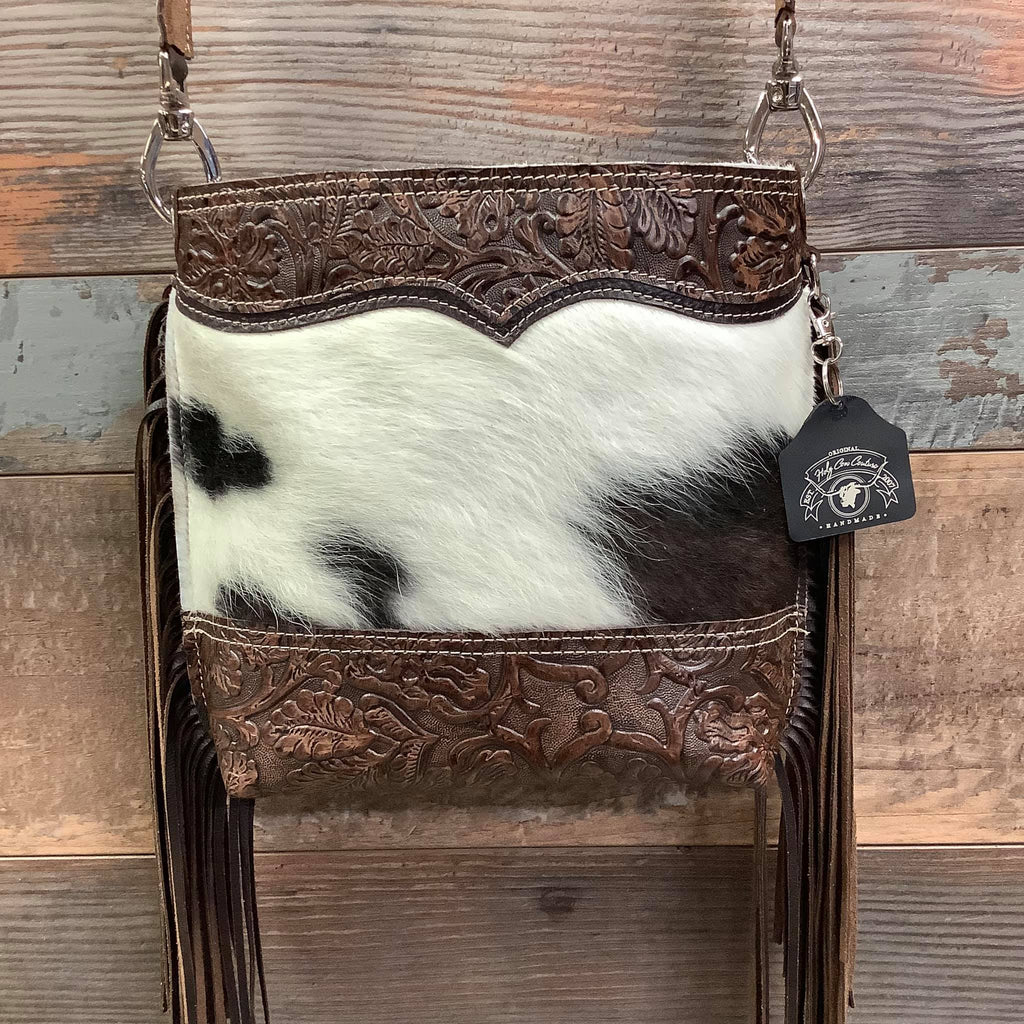 The Mini Messenger is a classic messenger bag with a cowgirl spin. This softly structured bucket bag is a great size for everyday use, and casual enough to take just about anywhere. It is lined with a soft flocked fabric and has an interior pocket for convenience. Made with natural hair-on hide and premium full-grain leather, each bag in the series has unique embossed leather trim with matching shoulder strap. Check out the classy bolero tie detail on some of the models in this stunning collection.
