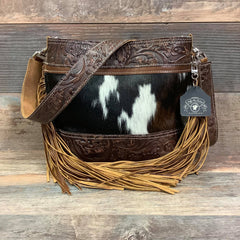 The Mini Messenger is a classic messenger bag with a cowgirl spin. This softly structured bucket bag is a great size for everyday use, and casual enough to take just about anywhere. It is lined with a soft flocked fabric and has an interior pocket for convenience. Made with natural hair-on hide and premium full-grain leather, each bag in the series has unique embossed leather trim with matching shoulder strap. Check out the classy bolero tie detail on some of the models in this stunning collection.