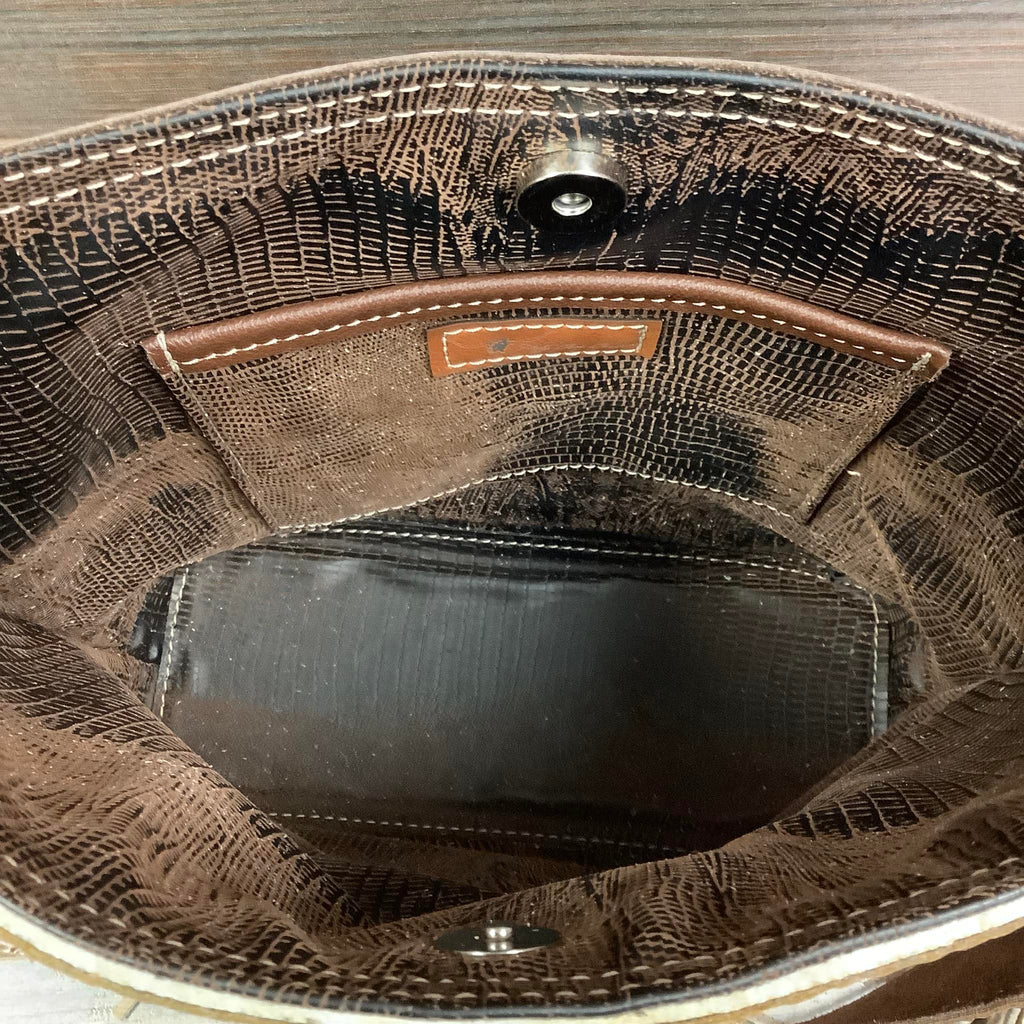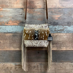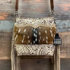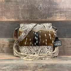 The Mini Messenger is a classic messenger bag with a cowgirl spin. This softly structured bucket bag is a great size for everyday use, and casual enough to take just about anywhere. It is lined with a soft flocked fabric and has an interior pocket for convenience. Made with natural hair-on hide and premium full-grain leather, each bag in the series has unique embossed leather trim with matching shoulder strap. Check out the classy bolero tie detail on some of the models in this stunning collection.