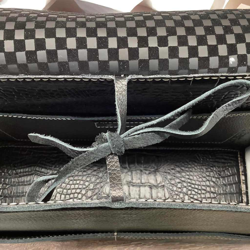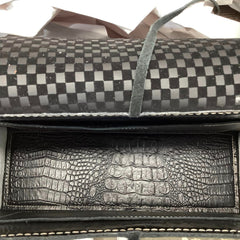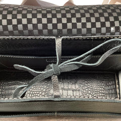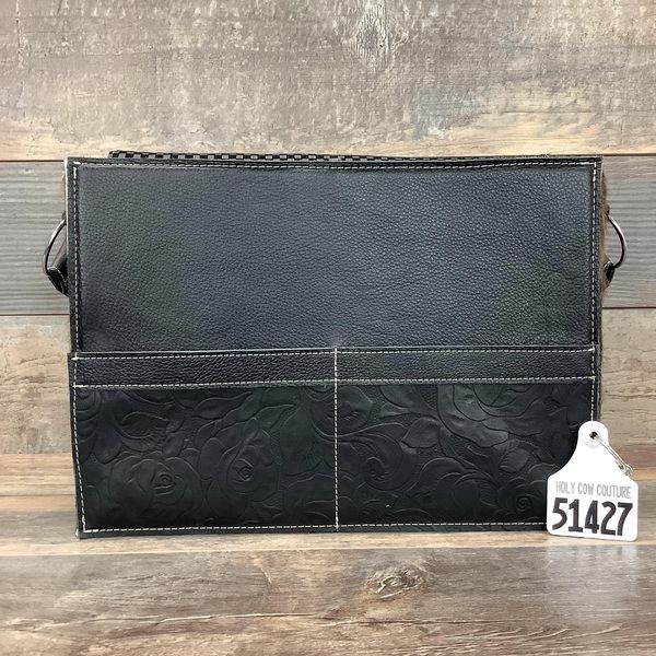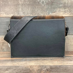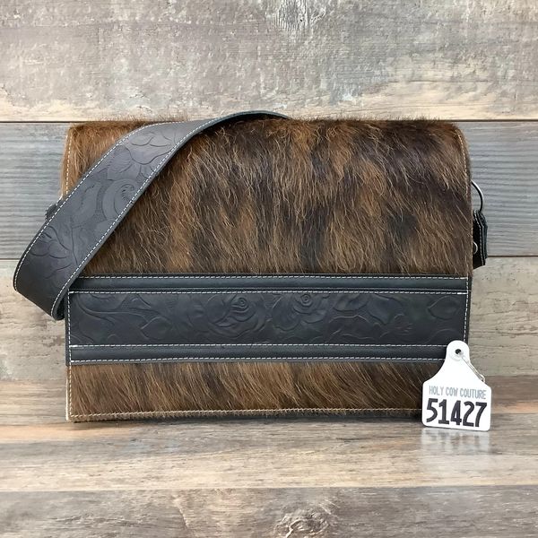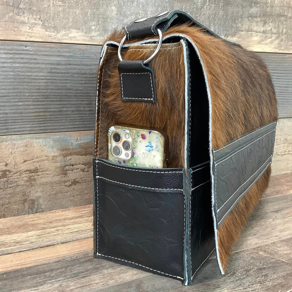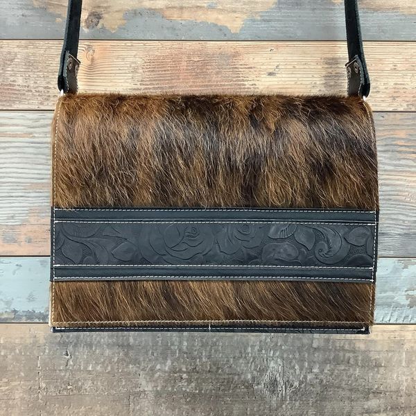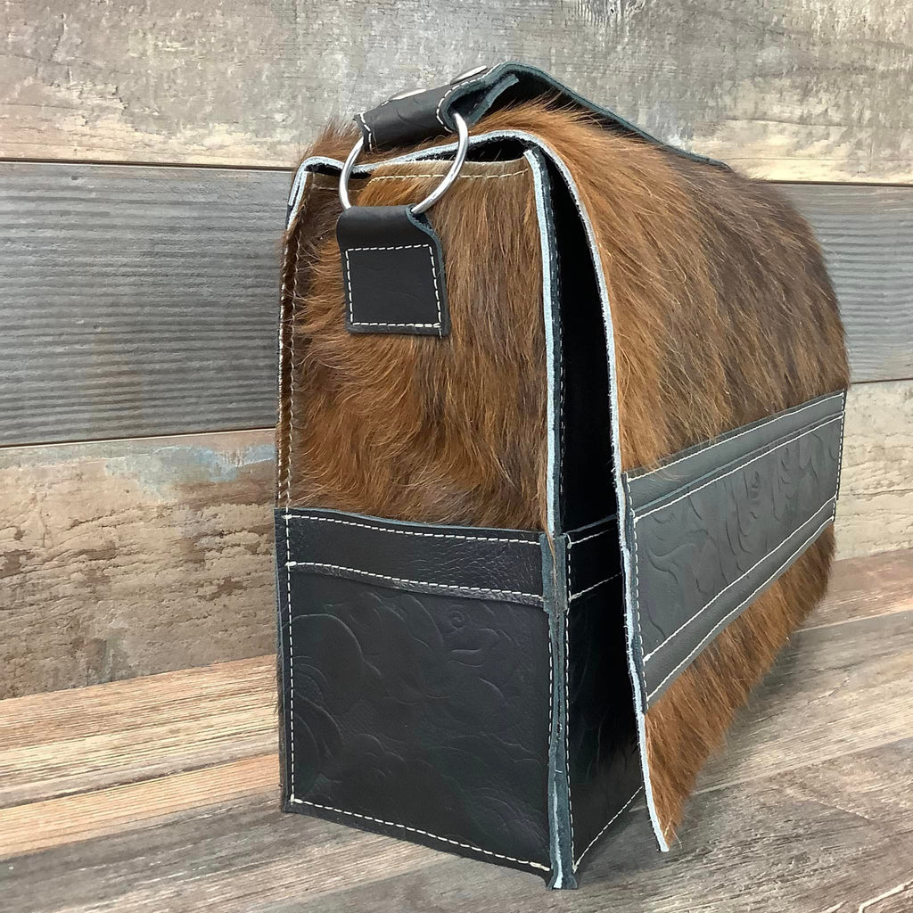Our Papoose is a smaller version of our Diaper Bag/All Purpose Bag. This fashionable tote can be used as a diaper, camera, school, or business bag. Comfortable to carry without compromising style, it features a distinctive premium hair on hide flap. Its 36” long and 2.5” wide leather shoulder strap is embossed on one side as a stunning accent, with suede on the underneath for a strong, non-slip grip. With two exterior fronts, two exterior sides and four interior pockets, and a faux leather lining for easy cleanup, the Papoose Tote couldn’t be more convenient. Its stiff structure allows it to maintain its shape and remain upright.