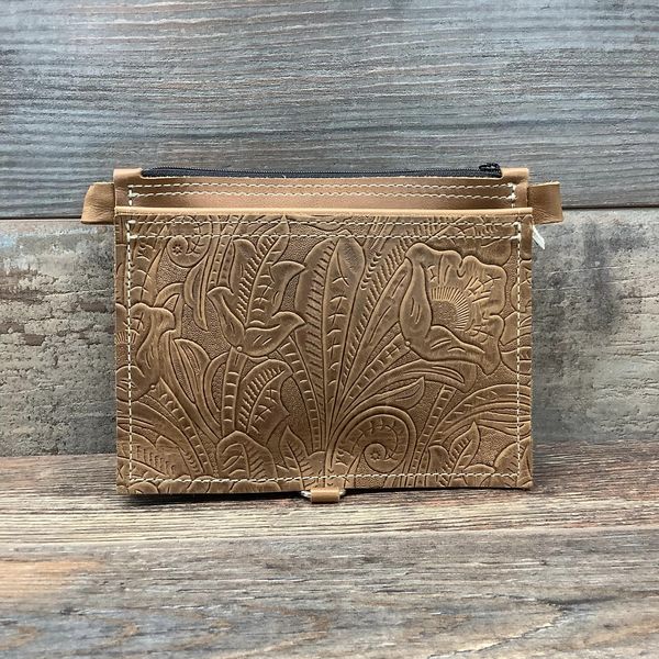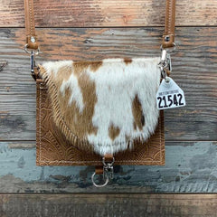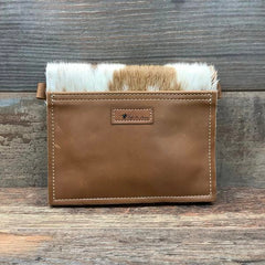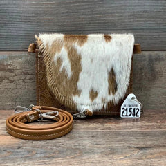 This handy crossbody is compact and functional for everyday use with style! One of our most popular small bags, we have reinvented it to be sturdy and compact so that you can have your things secure! It is designed with three pouches on the interior, the center pouch has a zipper closure to keep things secure, the back of this bag has an open sleeve pocket, perfect for your phone or our Card Holders! The leather flab has a clasp that will keep your things safe even if you stuff it full!  The crossbody strap is 1" wide made with matching leather.  We use premium quality leather and hair on hide on all our bags.