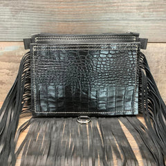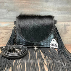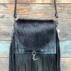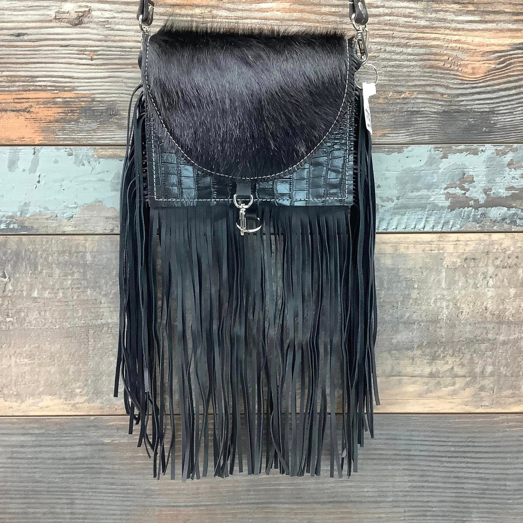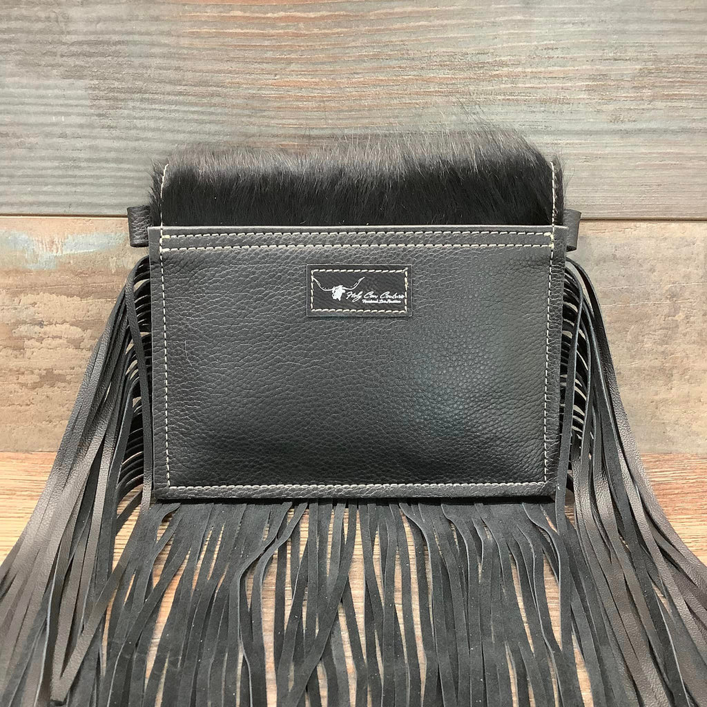 This handy crossbody is compact and functional for everyday use with style! One of our most popular small bags, we have reinvented it to be sturdy and compact so that you can have your things secure! It is designed with three pouches on the interior, the center pouch has a zipper closure to keep things secure, the back of this bag has an open sleeve pocket, perfect for your phone or our Card Holders! The leather flab has a clasp that will keep your things safe even if you stuff it full!  The crossbody strap is 1" wide made with matching leather.  We use premium quality leather and hair on hide on all our bags.
