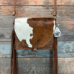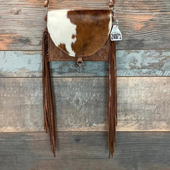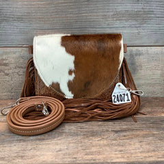 This handy crossbody is compact and functional for everyday use with style! One of our most popular small bags, we have reinvented it to be sturdy and compact so that you can have your things secure! It is designed with three pouches on the interior, the center pouch has a zipper closure to keep things secure, the back of this bag has an open sleeve pocket, perfect for your phone or our Card Holders! The leather flab has a clasp that will keep your things safe even if you stuff it full!  The crossbody strap is 1" wide made with matching leather.  We use premium quality leather and hair on hide on all our bags.
