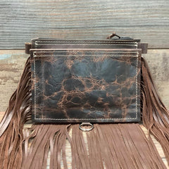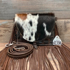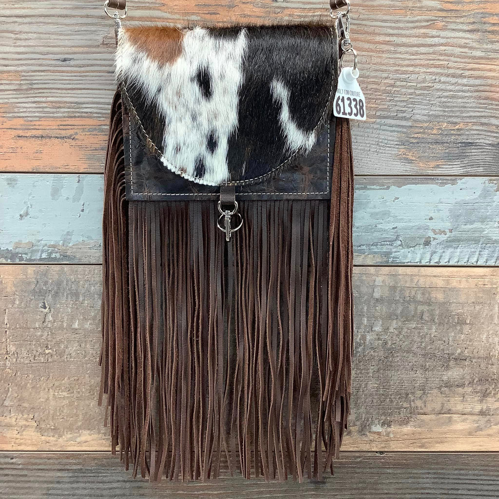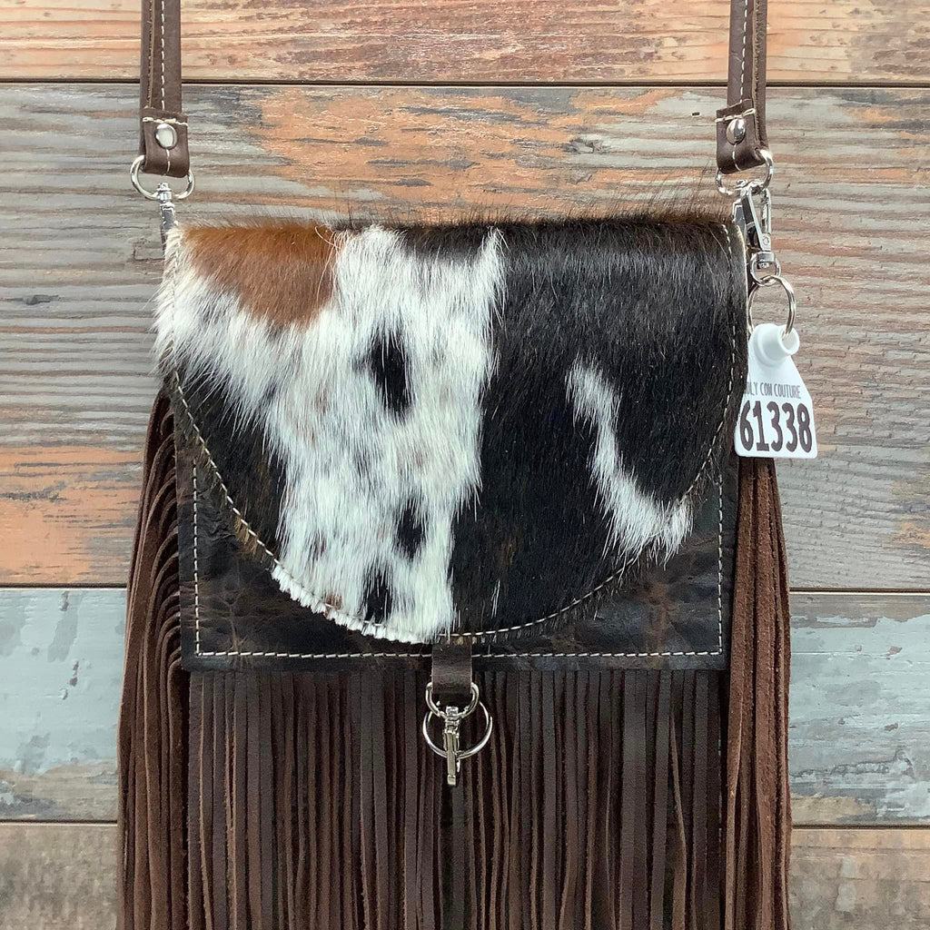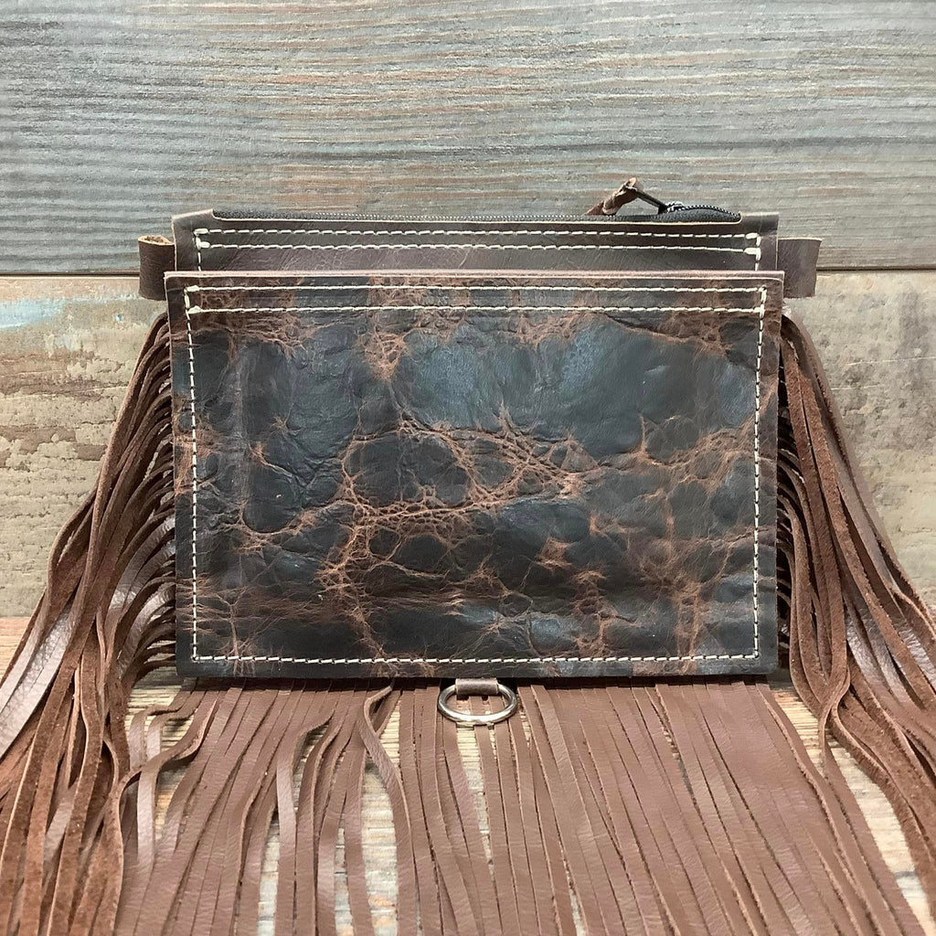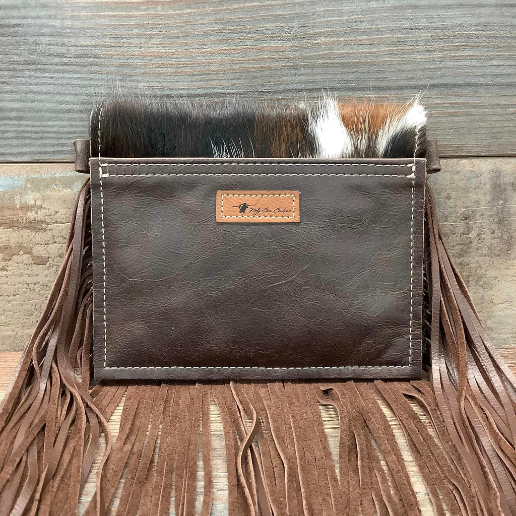 This handy crossbody is compact and functional for everyday use with style! One of our most popular small bags, we have reinvented it to be sturdy and compact so that you can have your things secure! It is designed with three pouches on the interior, the center pouch has a zipper closure to keep things secure, the back of this bag has an open sleeve pocket, perfect for your phone or our Card Holders! The leather flab has a clasp that will keep your things safe even if you stuff it full!  The crossbody strap is 1" wide made with matching leather.  We use premium quality leather and hair on hide on all our bags.