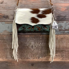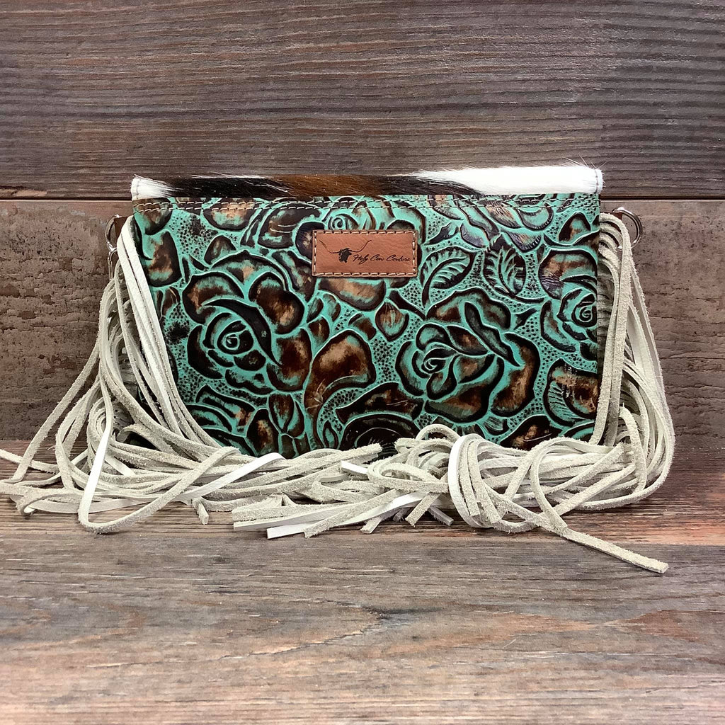 Our Sassy Mini Classy Cowgirl is a mini version of our Classy Cowgirl. This classy, fold over handbag can be hung casually over your shoulder or used as a clutch for a special evening out. The front flap with a gently curved edge is made from natural hair-on hide, while the back is crafted from elegant pebbled full-grain leather to prevent rubbing.