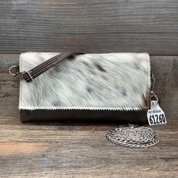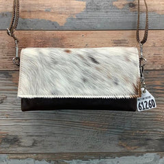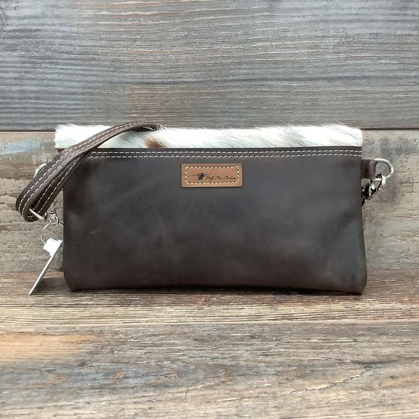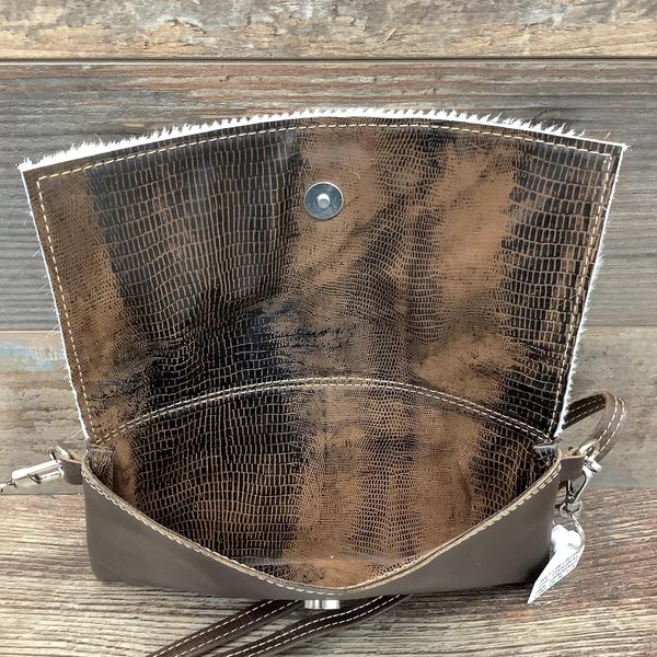 Our Sassy Mini Classy Cowgirl is a mini version of our Classy Cowgirl. This classy, fold over handbag can be hung casually over your shoulder or used as a clutch for a special evening out. The front flap with a gently curved edge is made from natural hair-on hide, while the back is crafted from elegant pebbled full-grain leather to prevent rubbing.