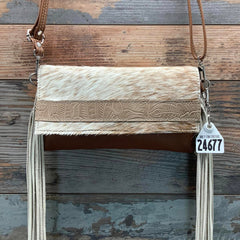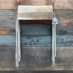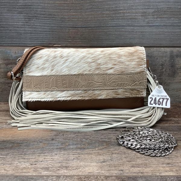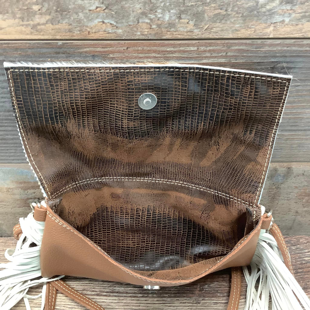 Our Sassy Mini Classy Cowgirl is a mini version of our Classy Cowgirl. This classy, fold over handbag can be hung casually over your shoulder or used as a clutch for a special evening out. The front flap with a gently curved edge is made from natural hair-on hide, while the back is crafted from elegant pebbled full-grain leather to prevent rubbing.