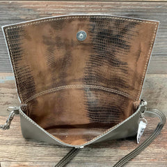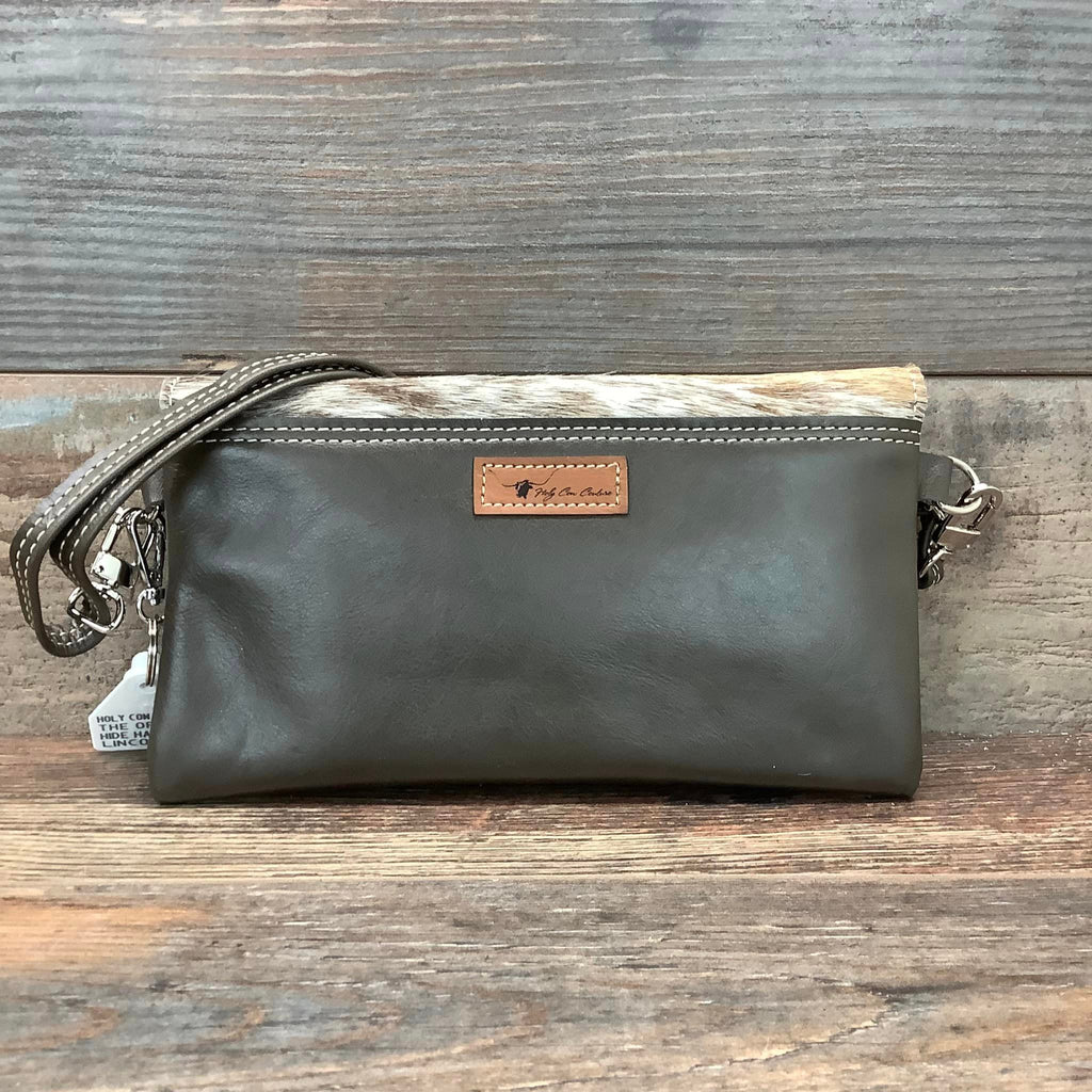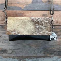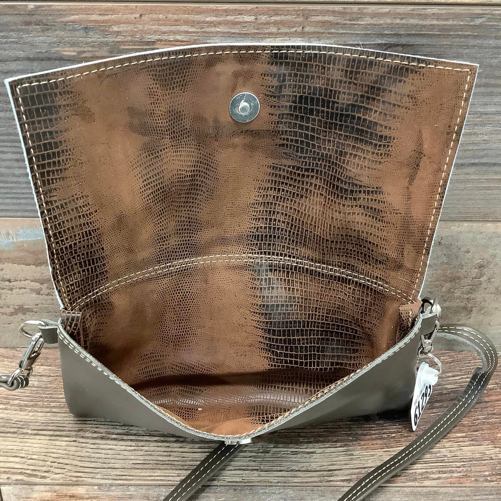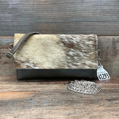 Our Sassy Mini Classy Cowgirl is a mini version of our Classy Cowgirl. This classy, fold over handbag can be hung casually over your shoulder or used as a clutch for a special evening out. The front flap with a gently curved edge is made from natural hair-on hide, while the back is crafted from elegant pebbled full-grain leather to prevent rubbing.