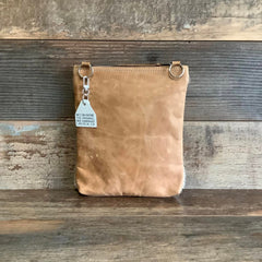 • Zippered top closure pouch with leather pull