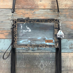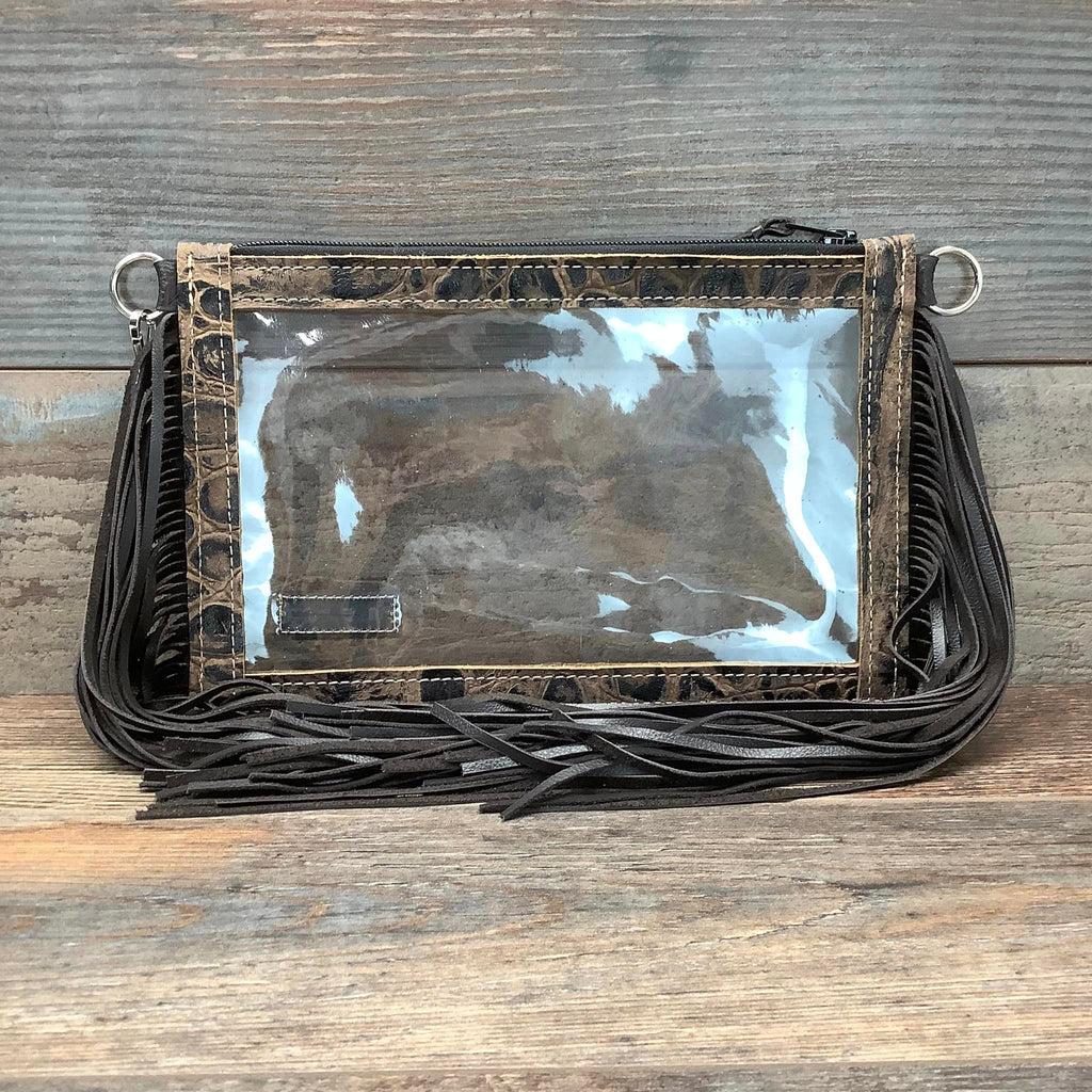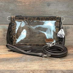 Our handy Stadium Ranch Hand is perfect for clear-bag-only events. It is a compact size to keep your hands free! It's large enough for your essentials and lightweight. It comes with a genuine leather 48" crossbody strap and a wristlet for convenience.