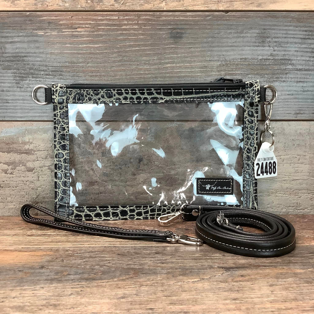 Our handy Stadium Ranch Hand is perfect for clear-bag-only events. It is a compact size to keep your hands free! It's large enough for your essentials and lightweight. It comes with a genuine leather 48" crossbody strap and a wristlet for convenience.