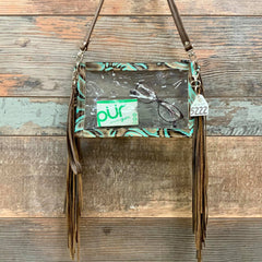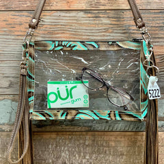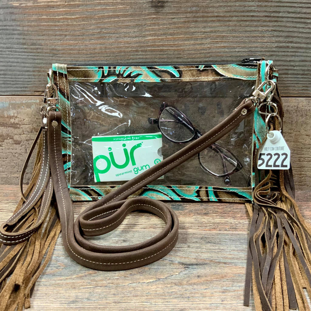 Our handy Stadium Ranch Hand is perfect for clear-bag-only events. It is a compact size to keep your hands free! It's large enough for your essentials and lightweight. It comes with a genuine leather 48" crossbody strap and a wristlet for convenience.